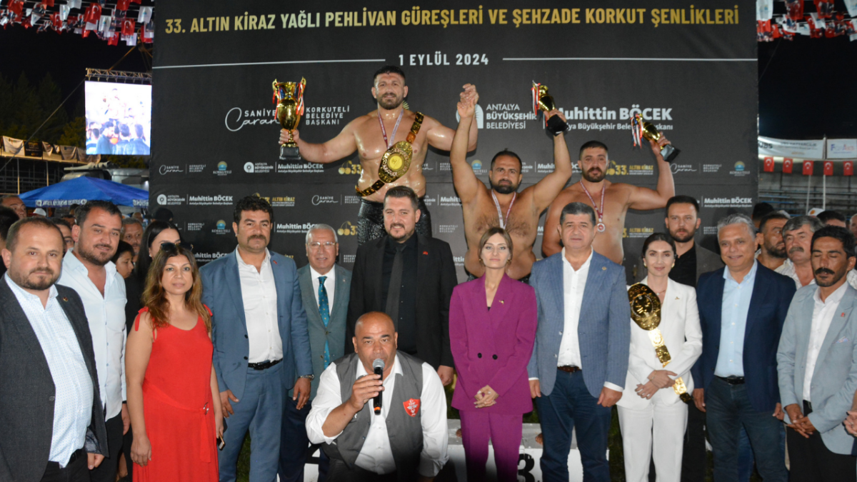 haberimizvar.net- Korkuteli'nde düzenlenen 33'üncü Geleneksel Altın Kiraz Yağlı Güreşleri'ne Türkiye'nin çeşitli bölgelerinden 72'si başpehlivan olmak üzere toplam 110 pehlivan katıldı. Korkuteli 100. Atatürk Stadyumu'ndaki güreşleri Antalya Büyükşehir Belediye Başkanı Muhittin Böcek, AK Parti Antalya milletvekilleri Mustafa Köse, İbrahim Ethem Taş, CHP Antalya Milletvekili Cavit Arı, çevre belediye başkanları, siyasi parti başkan ve yönetim kurulu üyeleriyle 20 bine yakın güreş sever izledi.