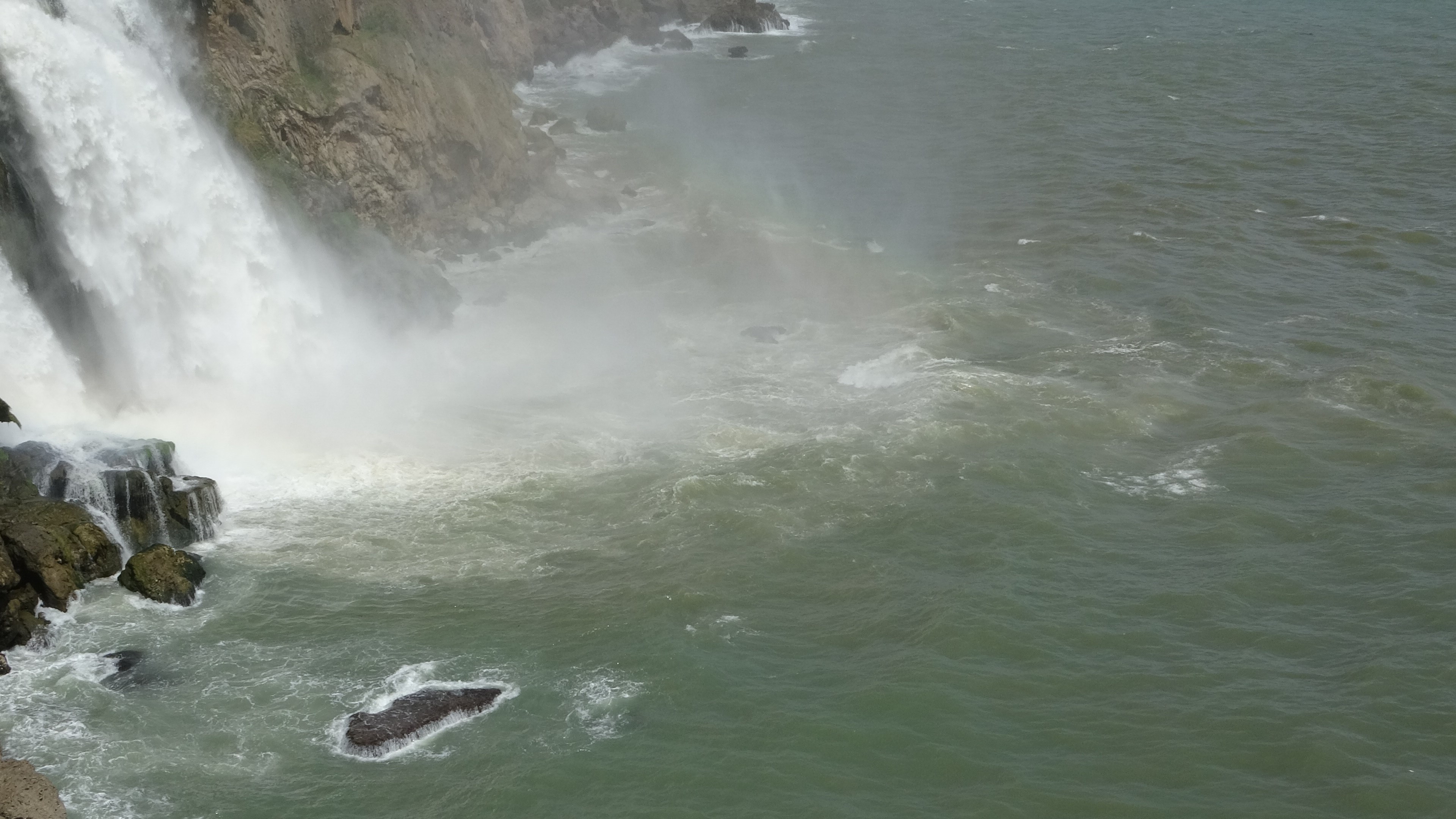 Antalya'da etkili olan sağanak yağışın ardından dünyaca ünlü Düden Şelalesi'nden denize dökülen çamurlu su, falezler bölgesinde görsel bir değişime neden oldu. Denizin masmavi renginin yerini kahverengiye bıraktığı o anlar, turistler tarafından merakla izlendi.