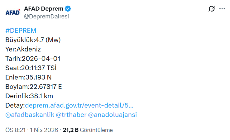 haberimizvar.net- Afet ve Acil Durum Yönetimi Başkanlığından (AFAD) aktarılan bilgiye göre Akdeniz açıklarında saat 20.11'de 4,7 büyüklüğünde deprem meydana geldi. AFAD'ın internet sitesinde yer alan açıklamada, merkez üssü Akdeniz açıkları olan 4,7 büyüklüğünde sarsıntı kaydedildiği bildirildi. Söz konusu depremin 38,01 kilometre derinlikte meydana geldiği belirlendi.