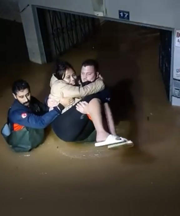 haberimizvar.net- Alanya'da dün etkili olan sağanak nedeniyle ilçenin birçok noktasında su baskınları yaşandı. İlçede çok sayıda ev ve iş yerini su bastı. Kızlarpınarı Mahallesi'nde yaşadığı dairenin girişinin suyla dolduğunu gören ismi öğrenilemeyen yabancı uyruklu kadın, gece yarısı 112 Acil Çağrı Merkezi'ni arayarak yardım istedi. İhbarla bölgeye AFAD ve İHH ekipleri sevk edildi. Kadın AFAD ve İHH ekiplerinin yardımıyla kurtarılarak, güvenli alana götürüldü. Kadın, ekiplere İngilizce teşekkür etti. Binanın girişini kaplayan su, itfaiye ekipleri tarafından tahliye edildi