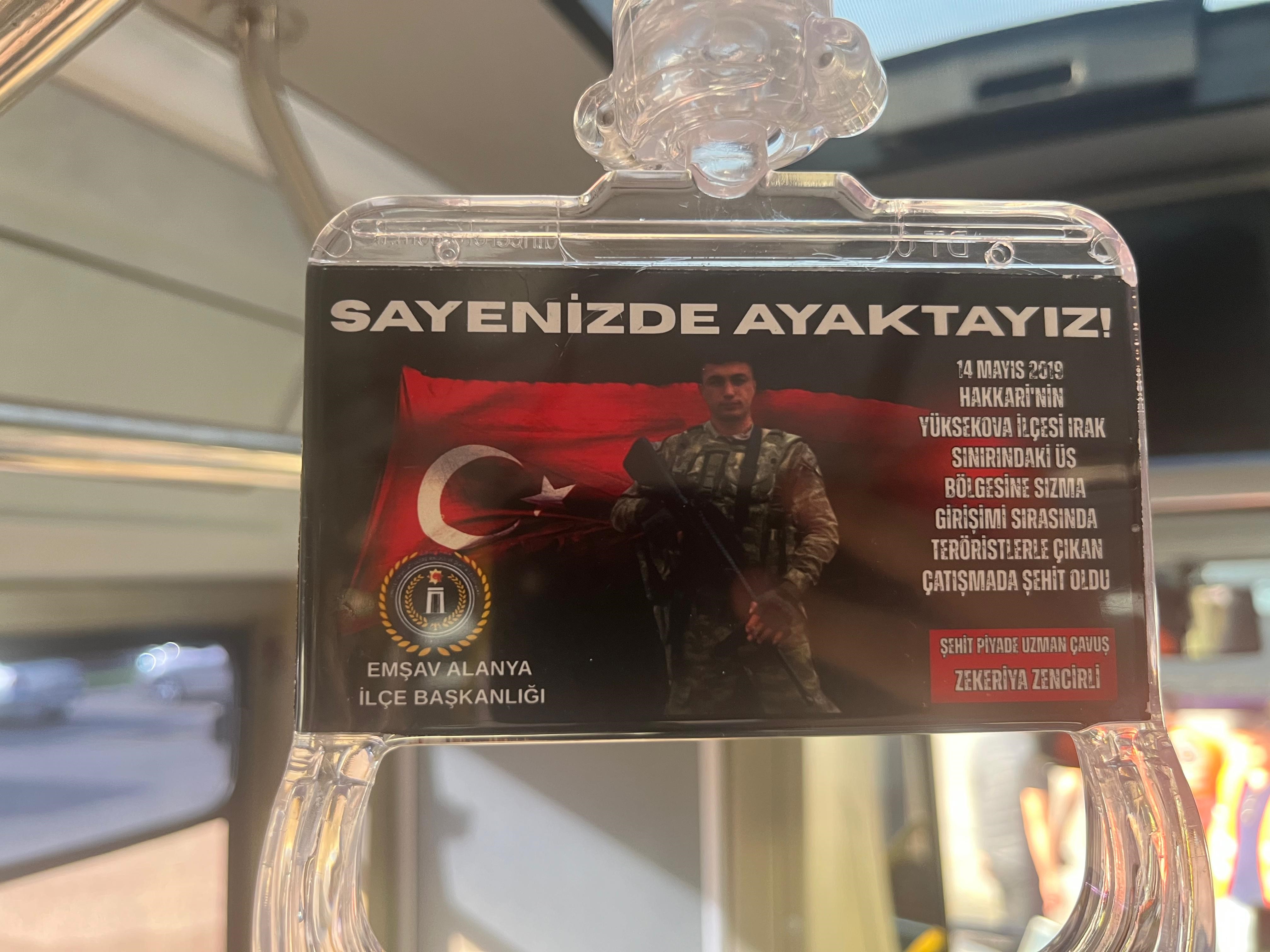Antalya'nın Alanya ilçesinde, şehit asker ve polislerin fotoğrafları ile bilgilerinin yer aldığı özel kartlar ve görseller otobüs tutamaçlarına basılarak 90 halk otobüsüne takıldı.