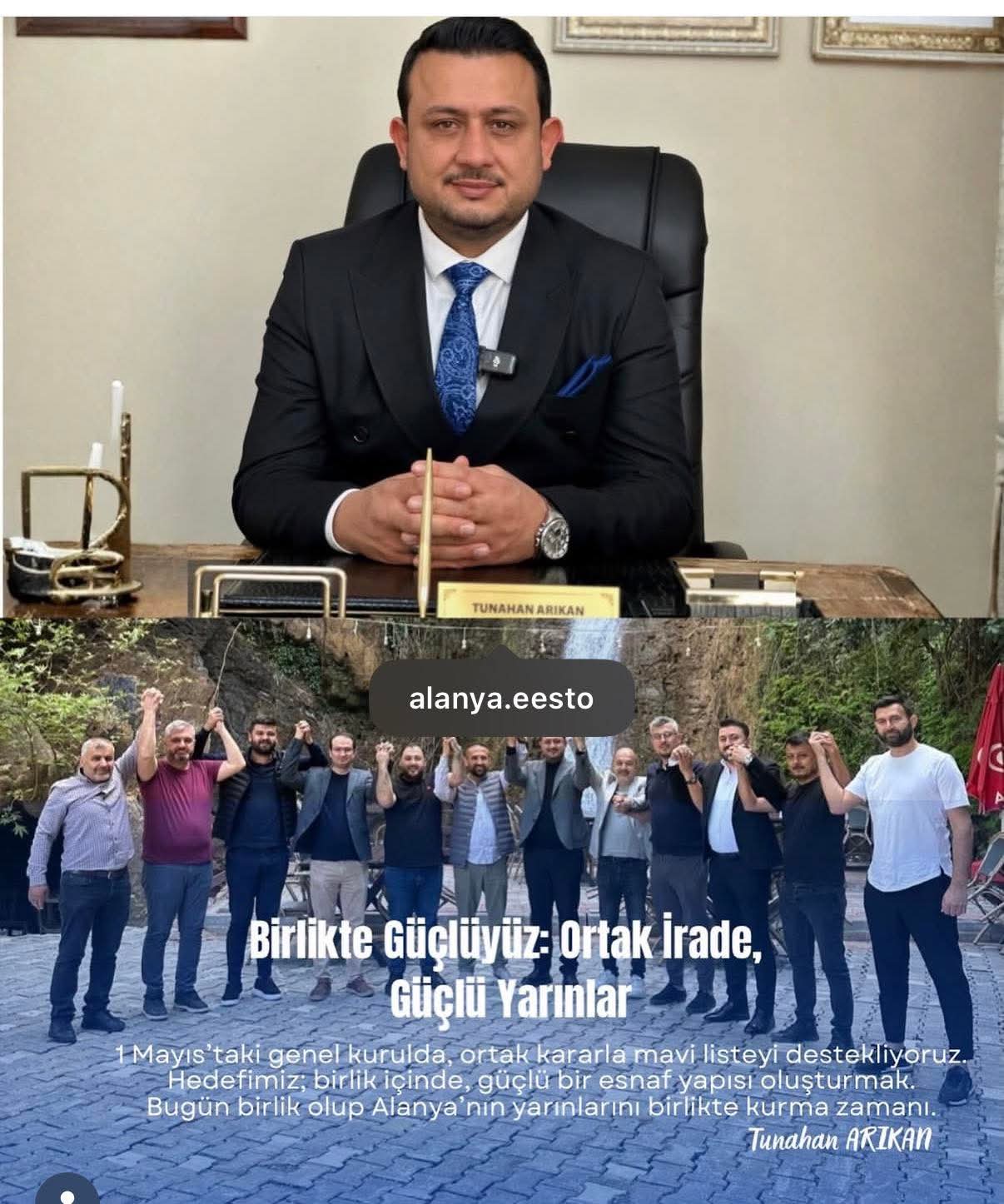 Alanya Elektrikçiler Elektronikçiler Sıhhi Tesisatçılar Esnaf Odası Başkanı Tunahan Arıkan sosyal medya hesabından yaptığı açıklamada mavi listeye yani AESOB Başkan Adayı Mehmet Ali Alkan'a destek vereceklerini açıkladı. Arıkan ekibiyle birlikte yer alan fotoğraflı paylaşımda kararını "1 Mayıs'taki Genel Kurulda ortak kararla mavi listeyi destekliyoruz. Hedefimiz birlik içinde güçlü bir esnaf yapısı oluşturmak. Bugün birlik olup Alanya'nın yarınlarını birlikte kurma zamanı" cümleleriyle duyurdu.
