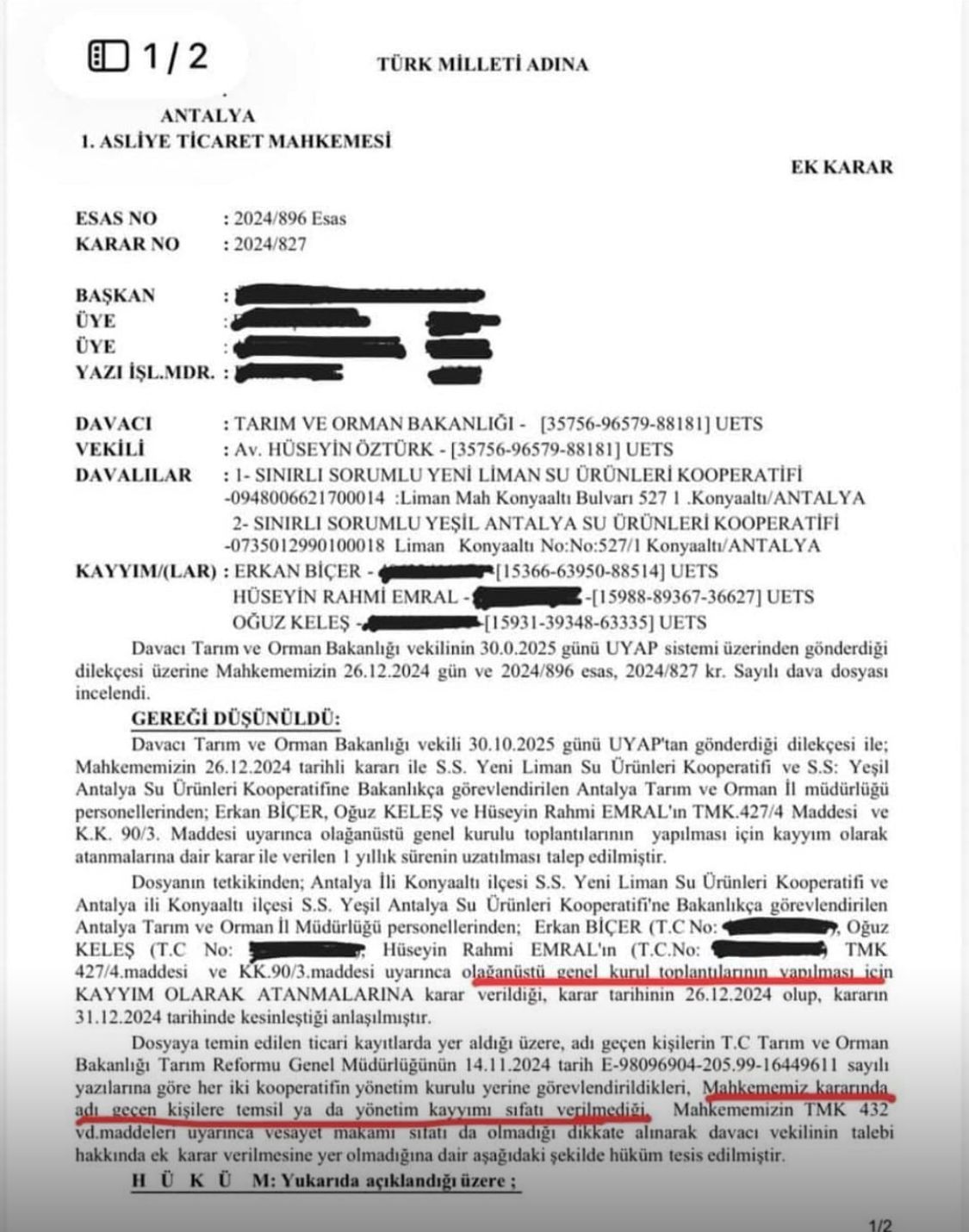 haberimizvar.net- Antalya Balıkçı Barınağı'nda sular durulmuyor. Antalya'daki S.S. Yeni Liman Su Ürünleri Kooperatifi ile S.S. Yeşil Antalya Su Ürünleri Kooperatifi arasında süren hukuki süreçte kritik bir karar çıktı. Tarım ve Orman Bakanlığı'nın, daha önce genel kurulu toplamak üzere görevlendirilen 3 kayyuma yönetim yetkisi verilmesi talebi mahkeme tarafından uygun bulunmadı. Antalya 1. Asliye Ticaret Mahkemesi Tarım ve Orman Bakanlığı'nın Antalya Balıkçı Barınağı'na atanan kayyumun yönetim kayyumu olarak atanması yönündeki talebini reddederek, daha önce atanan kayyumların yalnızca olağanüstü genel kurulu toplamakla görevli olduğunu belirtti.