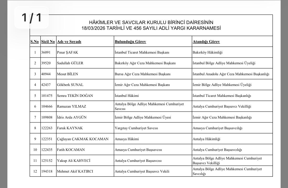 haberimizvar.net- Hakimler ve Savcılar Kurumu 1. Dairesi'nin 18 Mart 2026 tarih ve 456 sayılı Adli Yargı Kararnamesi açıklandı. Kararnameye göre;