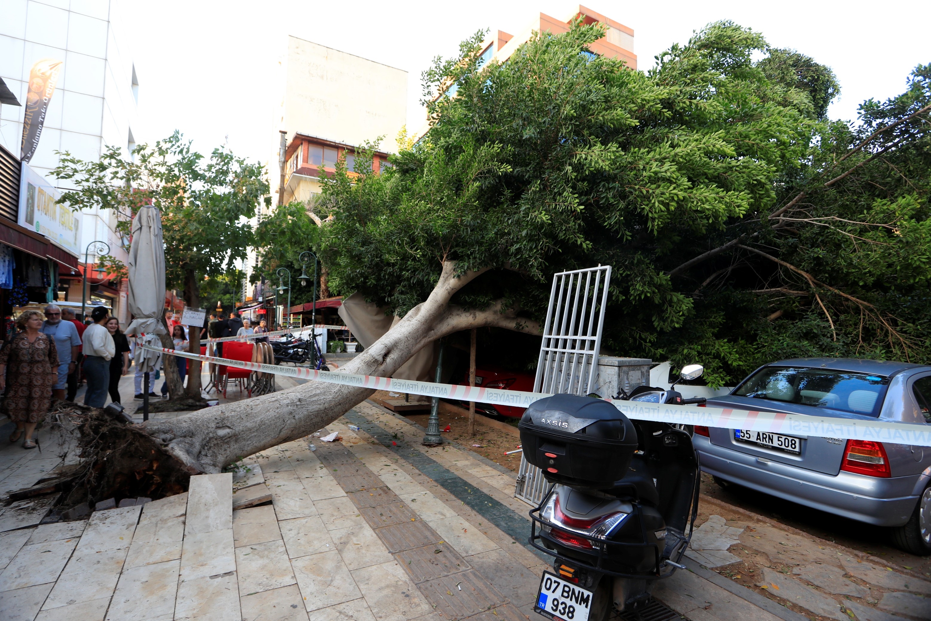 Antalya'da kaldırım üzerinde bulunan ağaç park halindeki araçların üzerine devrildi. 5 araçta büyük çapta maddi hasar meydana gelirken, bir kişi ağaç dallarının altında kalmakta son anda kurtuldu.