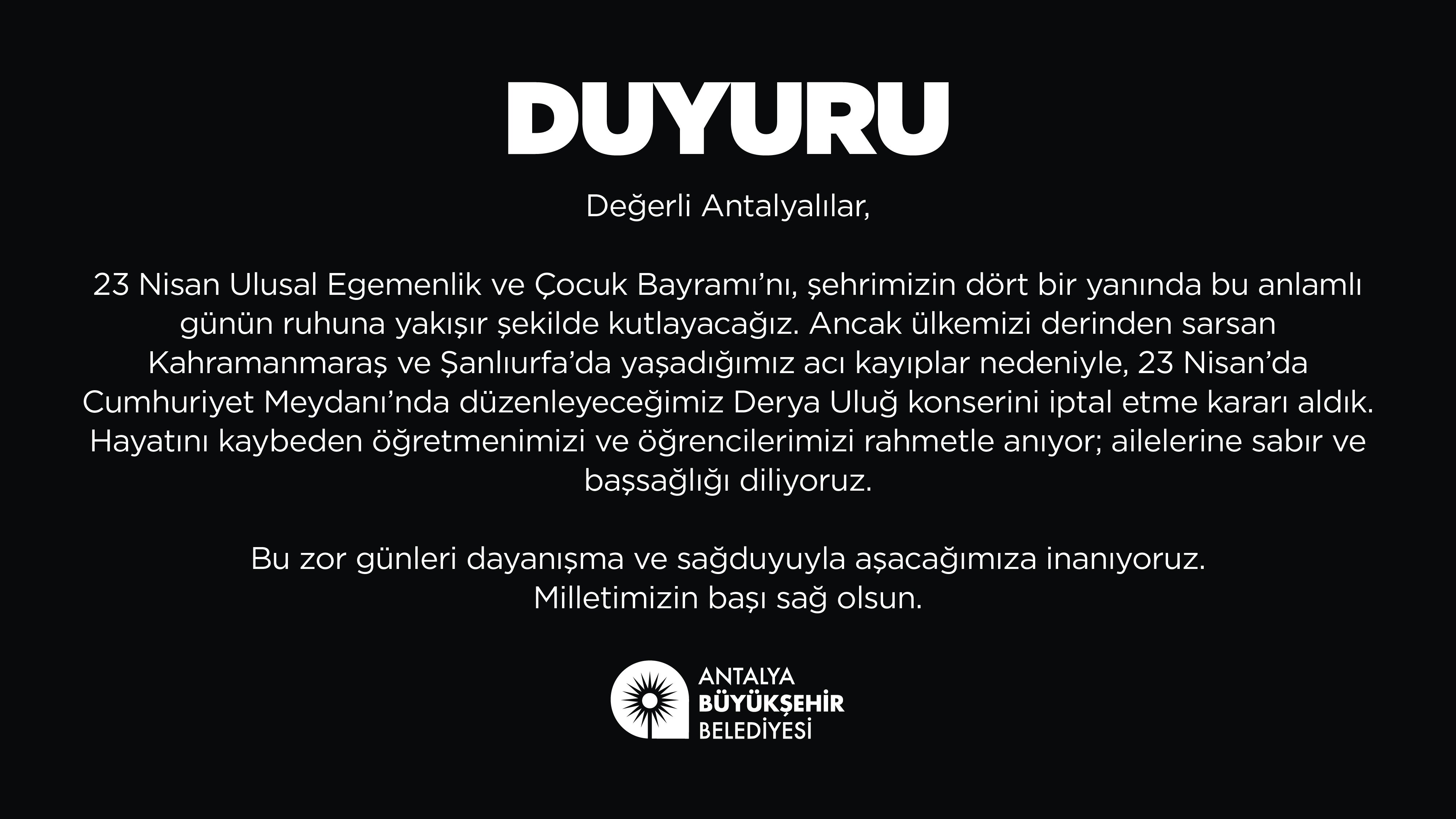 Antalya Büyükşehir Belediyesi, Türkiye'yi derinden sarsan Kahramanmaraş ve Şanlıurfa'da yaşanan acı kayıplar nedeniyle, 23 Nisan'da Cumhuriyet Meydanı'nda düzenlenecek Derya Uluğ konseri ile ilgili iptal kararı aldı.