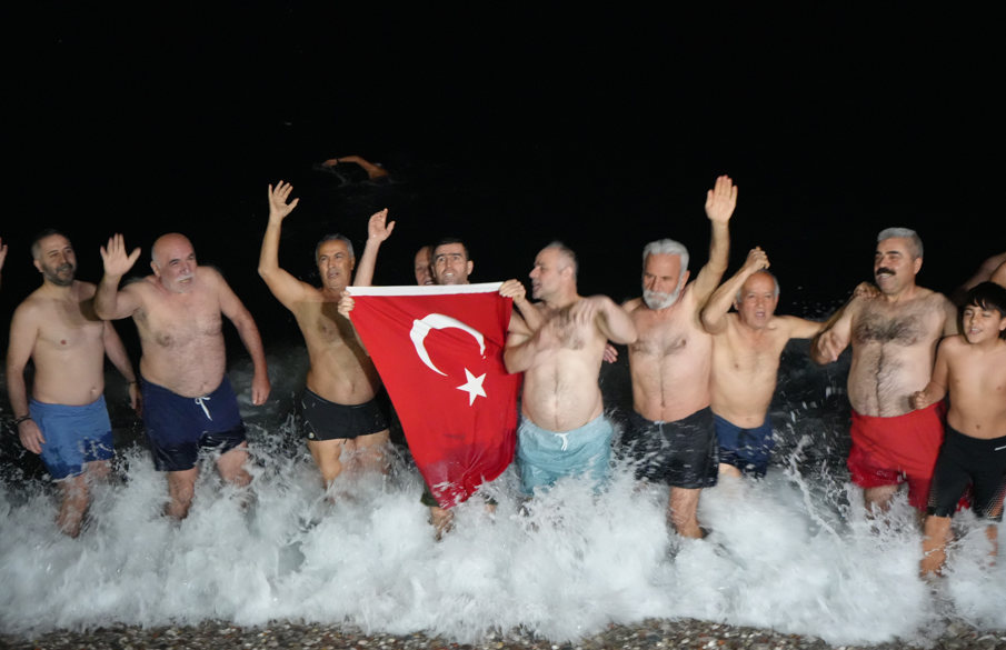 Gece saatlerinde Konyaaltı Sahili’nde bir araya gelen yaklaşık 30 kişilik grup, ellerinde Türk bayraklarıyla geri sayım yaparak yeni yılı denizde karşıladı. Saatler 00.00’ı gösterdiğinde ise grup üyeleri hep birlikte denize girerek 2026 yılının ilk dakikalarını Akdeniz’in serin sularında geçirdi.