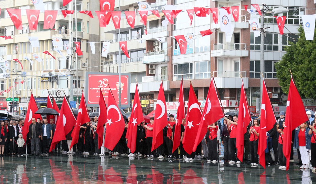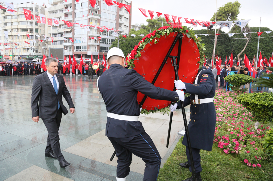 Öğrencilerin Türk bayraklarıyla süslediği meydanda, askeri bando eşliğinde çeşitli marşlar seslendirildi. Vali Şahin, Garnizon Komutanı Eren ve Büyükşehir Başkan Vekili Özdemir'in Atatürk Anıtı'na çelenk sunumunun ardından da saygı duruşunda bulunuldu ve İstiklal Marşı okundu. Tören sırasında yoğun sağanak görülürken, hem protokol hem de vatandaşlar yağıştan etkilendi. Tören boyunca yoğun yağışa rağmen ön taraftaki protokol üyeleri şemsiye kullanmazken, arkada bulunanlardan bazıları ise şemsiyeyle korunmaya çalıştı. Siyasi partiler ve sivil toplum örgütleri de anıta çelenk sunumu gerçekleştirdi.