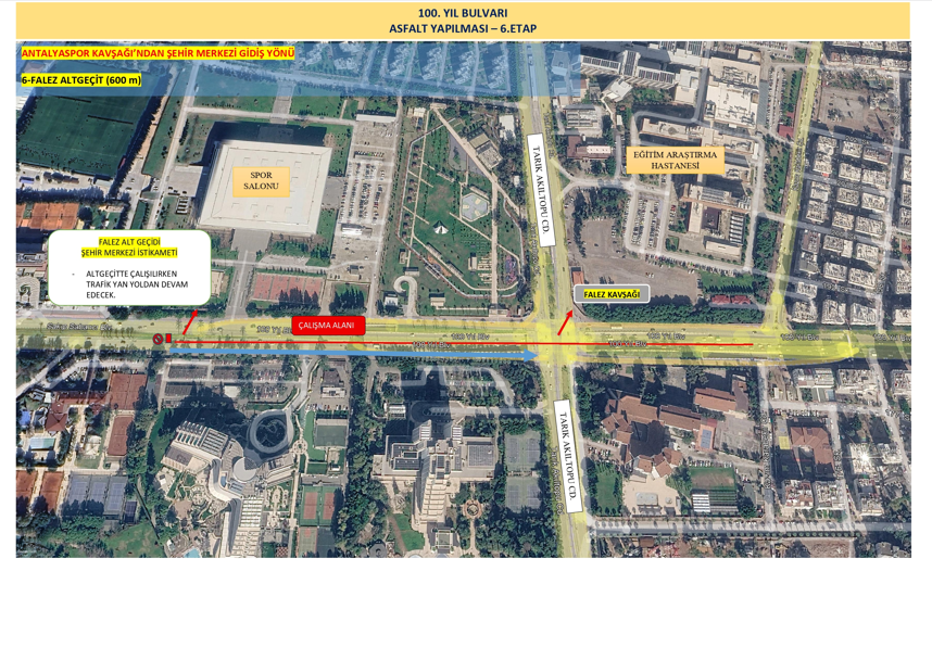 Çalışma kapsamında 25 Nisan Cumartesi saat 23.00 itibariyle mecburi yol kapatma yapılacak. Sakıp Sabancı Bulvarı’nın Konyaaltı istikametinden Şehir Merkezi gidiş yönü Falez Kavşağı alt geçit üzerinde yoğun bir çalışma yapılarak yolun 26 Nisan Pazar saat 12.00’de trafiğe açılması planlanıyor. Çalışma süresince sürücülerin, alternatif güzergâhları tercih etmeleri istendi.