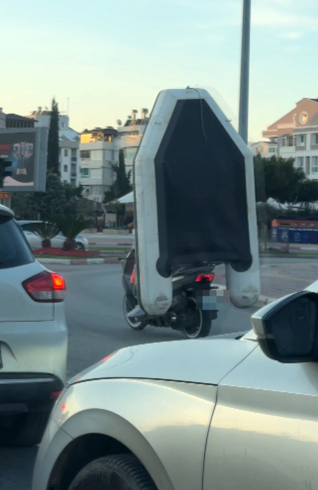 Konyaaltı ilçesinde motosikletle seyir halindeki iki kişinin şişme bot taşıdığı anlar cep telefonu kamerasıyla kaydedildi.