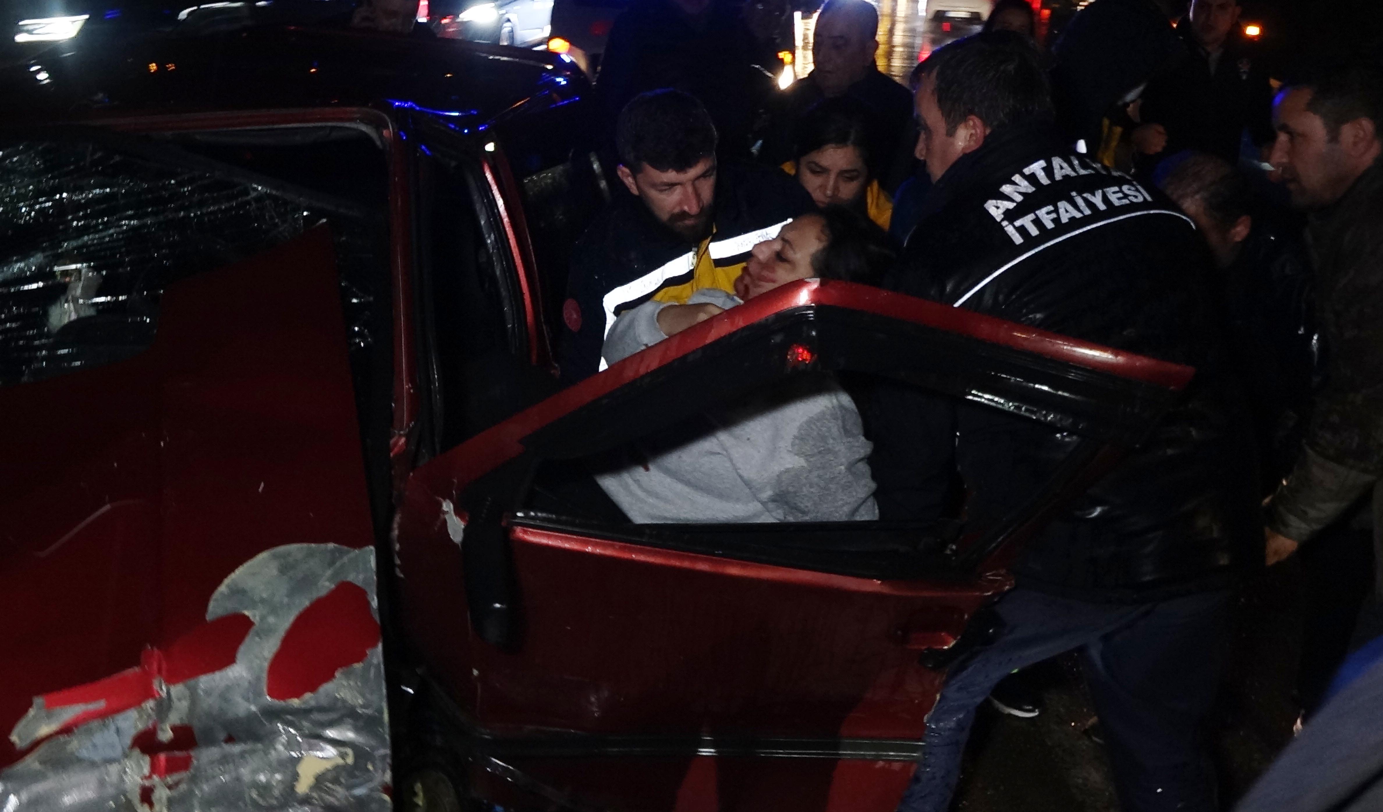 Antalya'da iki aracın çarpıştığı kazada 5 kişi yaralandı. Koltuğunda sıkışan sürücülerden Gül Ö., itfaiyenin yardımıyla kurtarıldı.