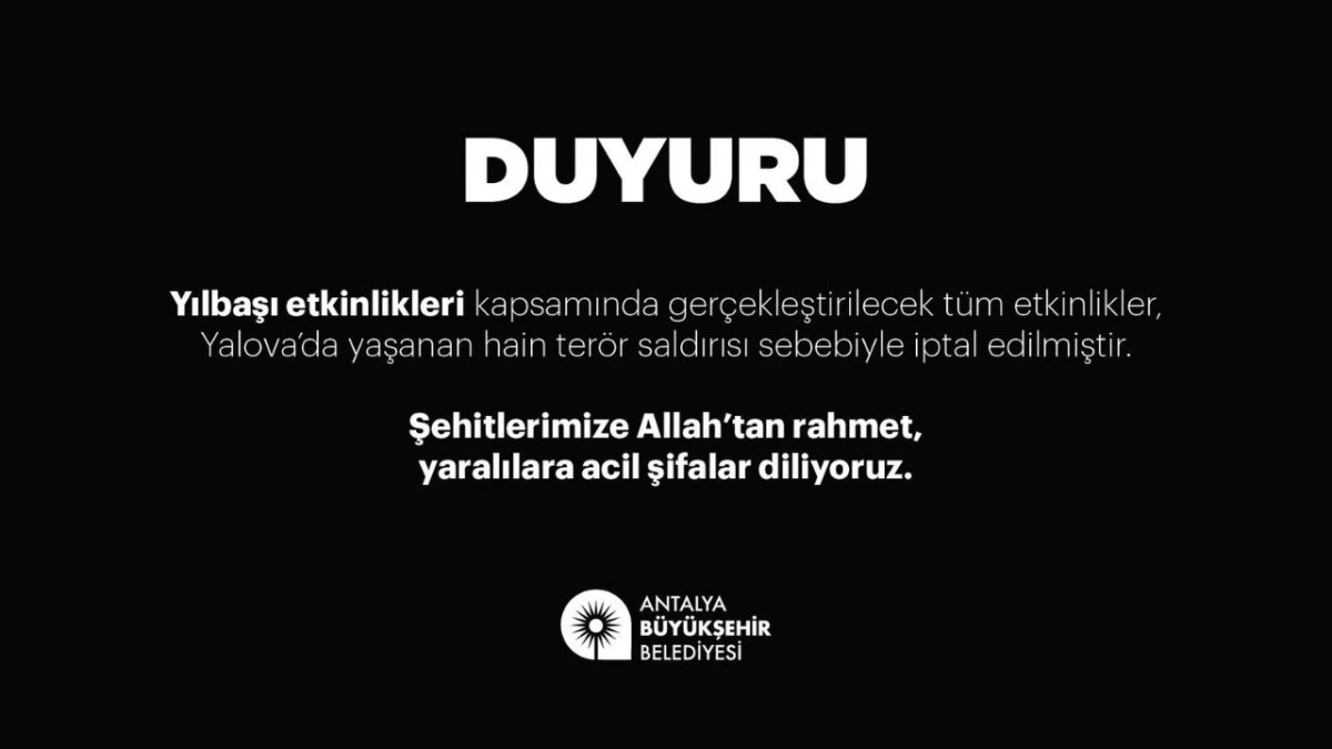 Antalya Büyükşehir Belediyesi'nden yapılan açıklamada, Yalova'da yaşanan terör saldırısı nedeniyle yılbaşı etkinliklerinin iptal edildiği belirtildi. Açıklamada, “Yalova'da hain teröristlerle çıkan çatışmada 3 kahraman polisimizin şehit olması dolayısıyla tüm yılbaşı etkinliklerimiz iptal edilmiştir. Kahraman şehitlerimize Allah'tan rahmet, yaralılara acil şifa diliyoruz. Başımız sağ olsun" ifadelerine yer verildi.