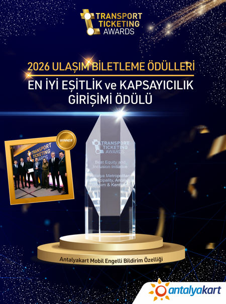 Antalya Büyükşehir Belediyesi iştiraki Antalya Ulaşım A.Ş. tarafından işletilen Antalyakart, Londra'da düzenlenen uluslararası Transport Ticketing Awards yarışmasında önemli bir başarıya imza attı. Antalyakart Mobil uygulamasına eklenen 'Mobil Engelli Bildirimi' özelliği, Antalya Büyükşehir Belediyesi'ne 2026 Ulaşım Biletleme Ödülleri'nde En İyi Eşitlik ve Kapsayıcılık Girişimi ödülünü kazandırdı.