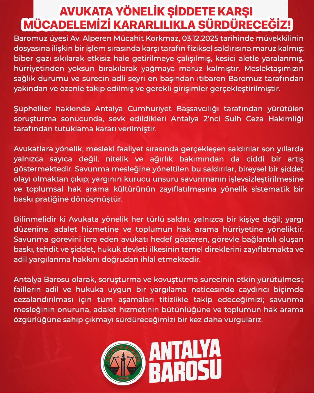 Antalya Barosu yaptığı açıklamada şu ifadelere yer verdi: “Baromuz üyesi Avukat Alperen Mücahit Korkmaz, 03.12.2025 tarihinde müvekkilinin dosyasına ilişkin bir işlem sırasında karşı tarafın fiziksel saldırısına maruz kalmış; biber gazı sıkılarak etkisiz hale getirilmeye çalışılmış, kesici aletle yaralanmış, hürriyetinden yoksun bırakılarak yağmaya maruz kalmıştır. Meslektaşımızın sağlık durumu ve sürecin adli seyri en başından itibaren Baromuz tarafından yakından ve özenle takip edilmiş ve gerekli girişimler gerçekleştirilmiştir