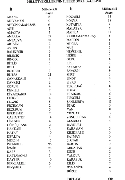 Türkiye’nin en kalabalık şehri olan İstanbul 96 milletvekili ile zirvede yer alırken, Bayburt 1 milletvekili ile en az vekil çıkaran il oldu.