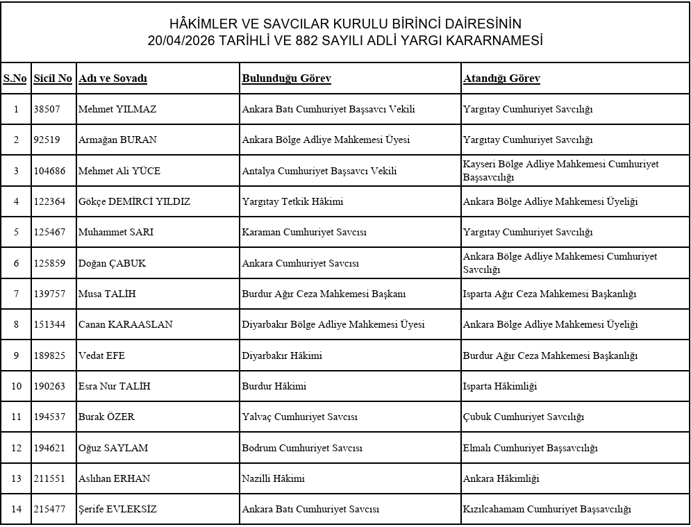 haberimizvar.net- Hakimler ve Savcılar Kurulu (HSK) Birinci Dairesi’nin 20 Nisan 2026 tarihli Kararnamesi yayımlandı. Kararname kapsamında çok sayıda hakim ve savcının görev yeri değişirken, Antalya, Burdur ve Isparta'da da atamalar yer aldı.