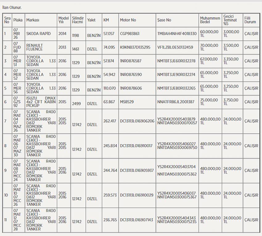 haberimizvar.net ANTEPE İnşaat. ve Tic. A.Ş.’nin mülkiyetindeki 11 aracın satışı 14 Ekim Pazartesi günü saat 14.00-17.00 arasında ANTEPE İnşaat ve Tic. A.Ş’nin Tahılpazarı Mahallesi Şarampol Caddesi No:84 Mark Antalya K:6 -Toplantı Salonu adresinde, kapalı zarfla teklif alma açık arttırma usulü yapılacak. Satışa sunulan 11 araç içerisinde 5 adet otomobil, 1 adet Pick-up araç ve 5 adet yarı römork tanker bulunuyor. Hepsinin çalışır durumda olduğu araçların en düşük muammen bedeli 60 bin lira olurken en yüksek muammen bedel ise 480 bin lirayı buluyor.