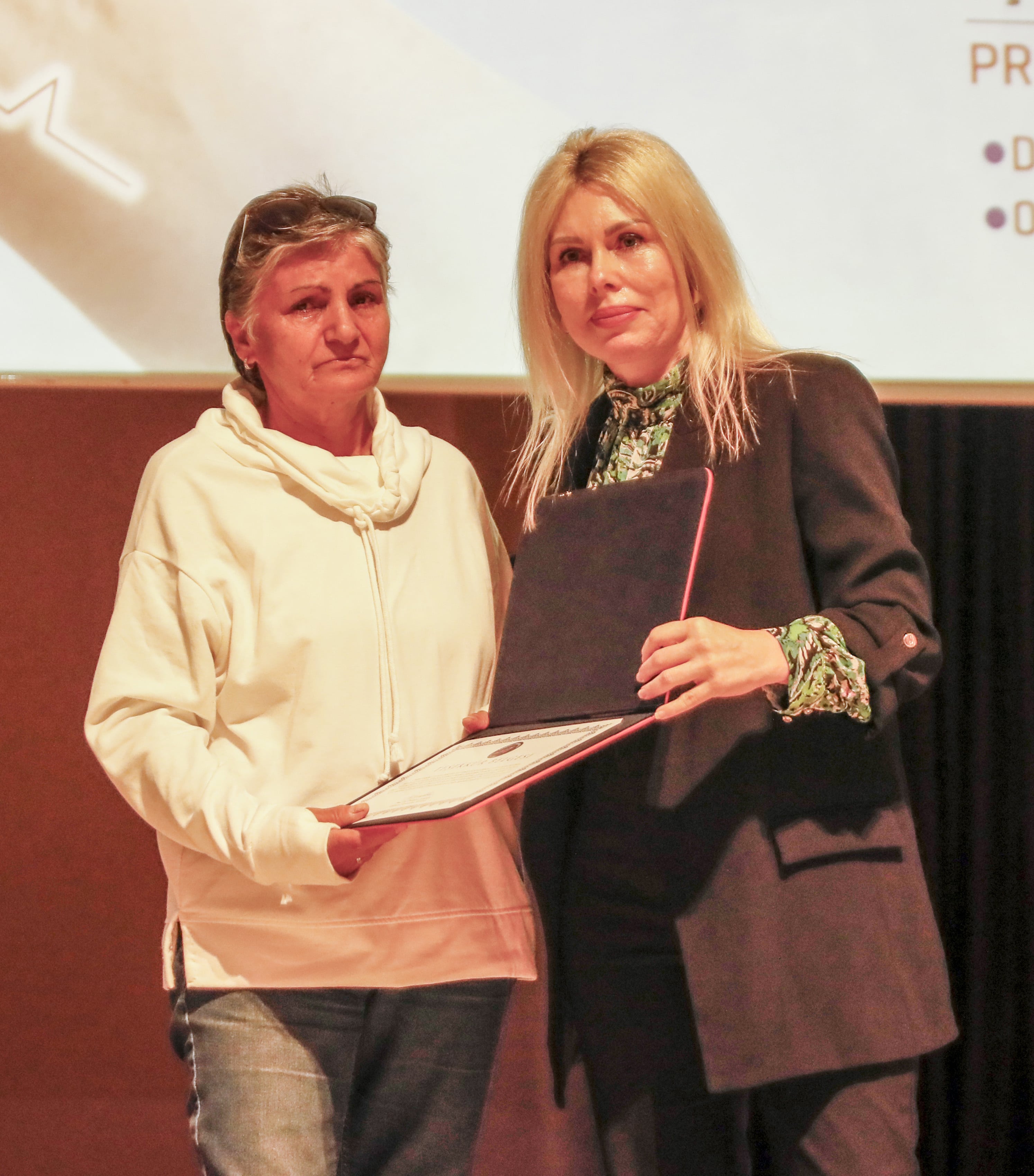 Ardından sahneye gelen 47 yaşında beyin kanaması nedeniyle hayata gözlerini yuman ve organları ailesi tarafından bağışlanan Mehmet Toprak'ın eşi Nazlı Toprak geldi. Prof. Dr. Ömer Özkan'ın elinden teşekkür plaketini alan Toprak, "Bu kararı vermemde en çok yardımcı olan 22 ve 17 yaşındaki kızlarımdı. Onlar babalarının sayesinde başka çocuklar sevinsin, başka aileler mutlu olsun istediler. Onların kararıydı. Onun bize vasiyetiydi organlarını bağışlamak. 'Acaba kime gitti, hastalar iyiler mi, aileleri mutlu oldu mu?' diye düşünmediğimiz bir gün bile yok. Çok üzgünüz ama böyle bir şey yaşadığımız için de çok gururluyuz" dedi.