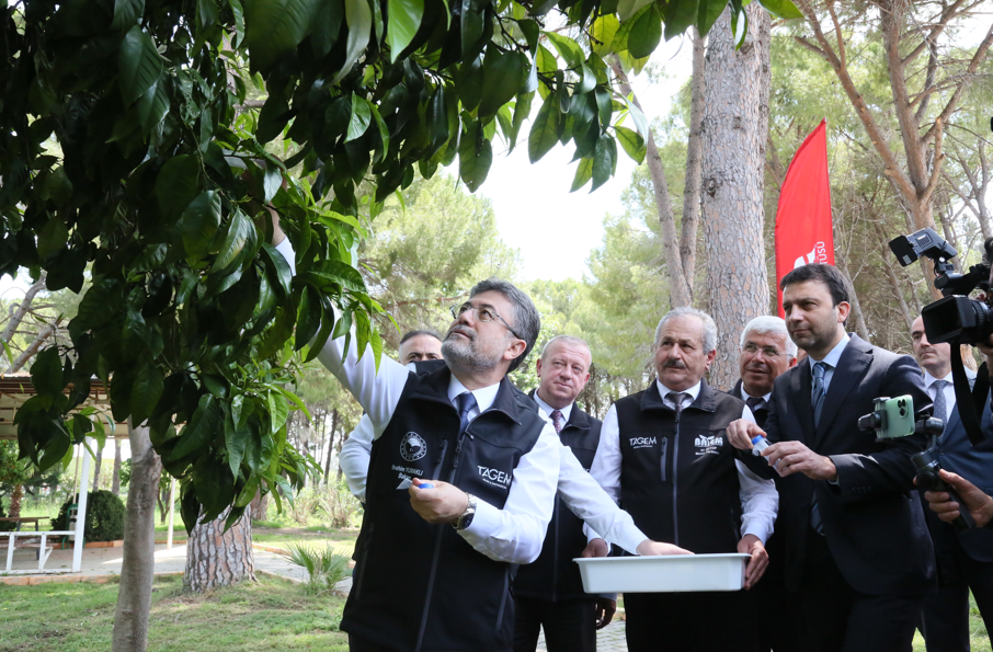 Tarım ve Orman Bakanı Yumaklı, laboratuvar incelemelerinin ardından turunçgil zararlılarına karşı üretilen biyolojik mücadele kapsamındaki yararlı böceklerin salınımını BATEM'in bahçesindeki portakal ağaçları üzerinde gerçekleştirdi.