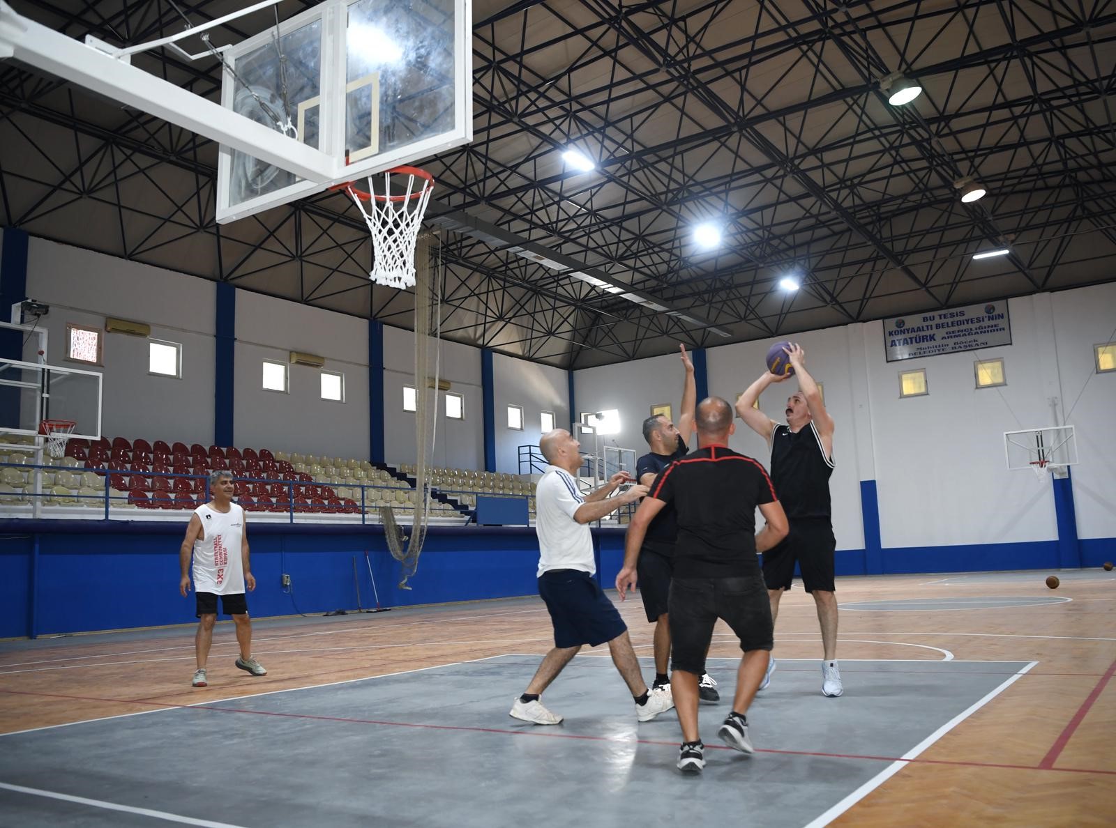 Konyaaltı Belediye Başkanı Cem Kotan, halka kazandırılan yeni spor tesisinin basketbol sahasını birim müdürleri yaptığı maçla denedi.