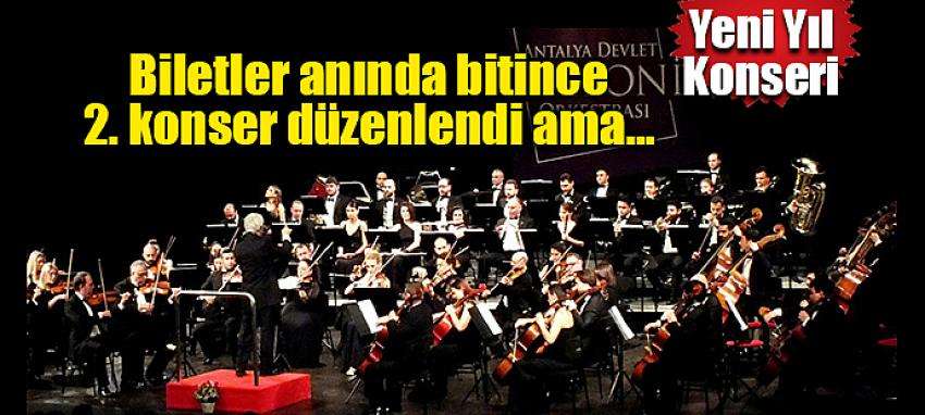 Antalya Devlet Senfoni Orkestrası’nın her yıl düzenlediği ‘Yeni Yıl Konseri’nin biletleri anında tükenince 2. program düzenlendi. 2. Konserin bilet satışı da bir saatte sanatseverler tarafından satın alındı.