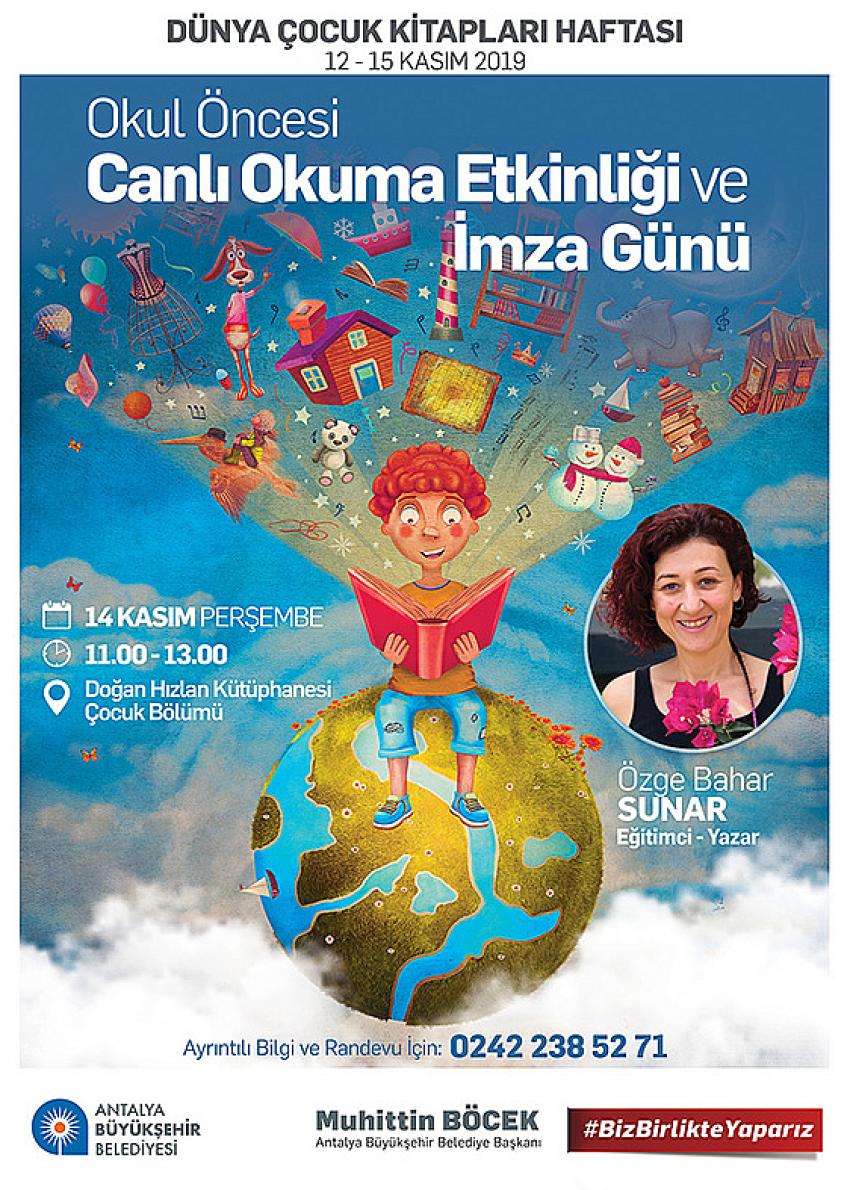 Antalya Büyükşehir Belediyesi, 12-15 Kasım Dünya Çocuk Kitap Haftası dolayısıyla Doğan Hızlan Kütüphanesi'nde Canlı Kitap Okuma Etkinliği düzenliyor. Etkinlik kapsamında Eğitimci Yazar Özge Bahar Sunar'ın 14 Kasım'da imza günü olacak