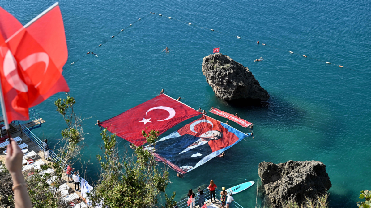 Antalya'da 29 Ekim Cumhuriyet Bayramı dolayısıyla cankurtaranlar denizde Türk bayrağı, Atatürk posteri ve 'Yaşasın Cumhuriyet' yazılı pankart açtı.