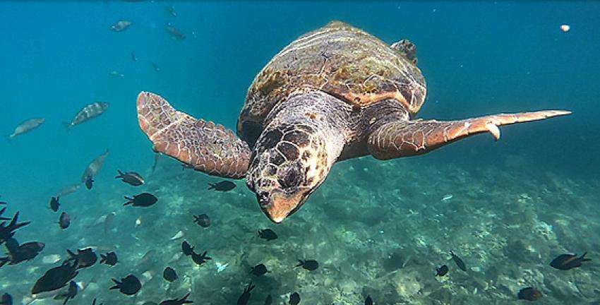 Antalya'nın turistik İlçesi Kaş'ta ortaya çıkan iki yetişkin caretta caretta türü deniz kaplumbağası, turistlerin ilgi odağı oldu. Sahile yakın bir noktada su yüzeyine çıkan carettalarla yüzen turtistler, zaman zaman kamlumbağanın başını da okşadı. Bütün bu renkli anları ise su altı kamerasıyla görüntülendi