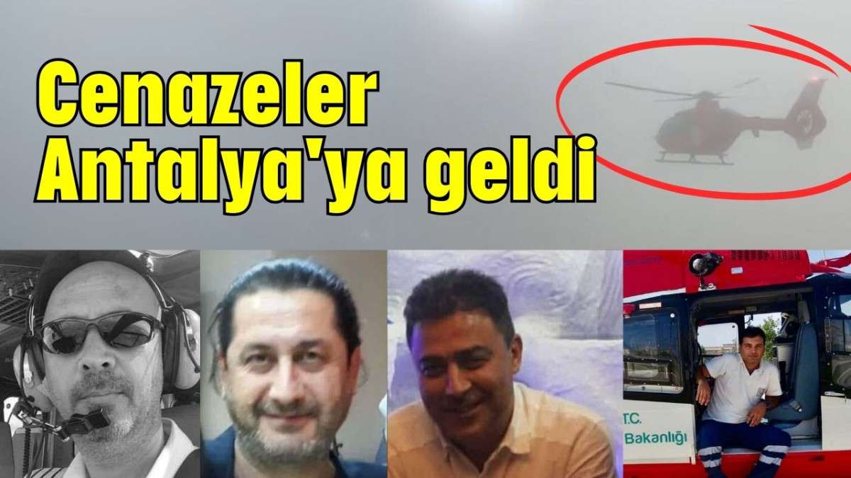 Muğla'da yaşanan helikopter kazasının ardından yaşamını yitirenlerin cenazeleri Antalya'ya gönderildi. Yarın saat 11.00'de Antalya'da düzenlenecek resmi törenin ardından kaybeden sorumlu pilot Tamer Gönül , pilot Bayram Çiçek , doktor Cengiz Coşkun memleketlerine, sağlık memuru Selçuk Saykal ise Kepez İlçesi'nde toprağa verilecek.