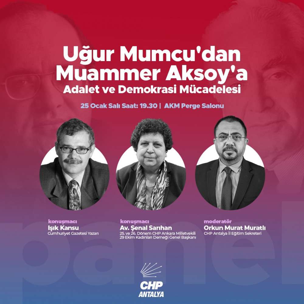 Cumhuriyet Halk Partisi (CHP) Antalya İl Başkanlığı, Adalet ve Demokrasi Haftası etkinlikleri kapsamında AKM Perge Salonu’nda 25 Ocak Salı günü “Uğur Mumcu’dan Muammer Aksoy’a Adalet ve Demokrasi Mücadelesi” adlı bir panel düzenleyecek.
