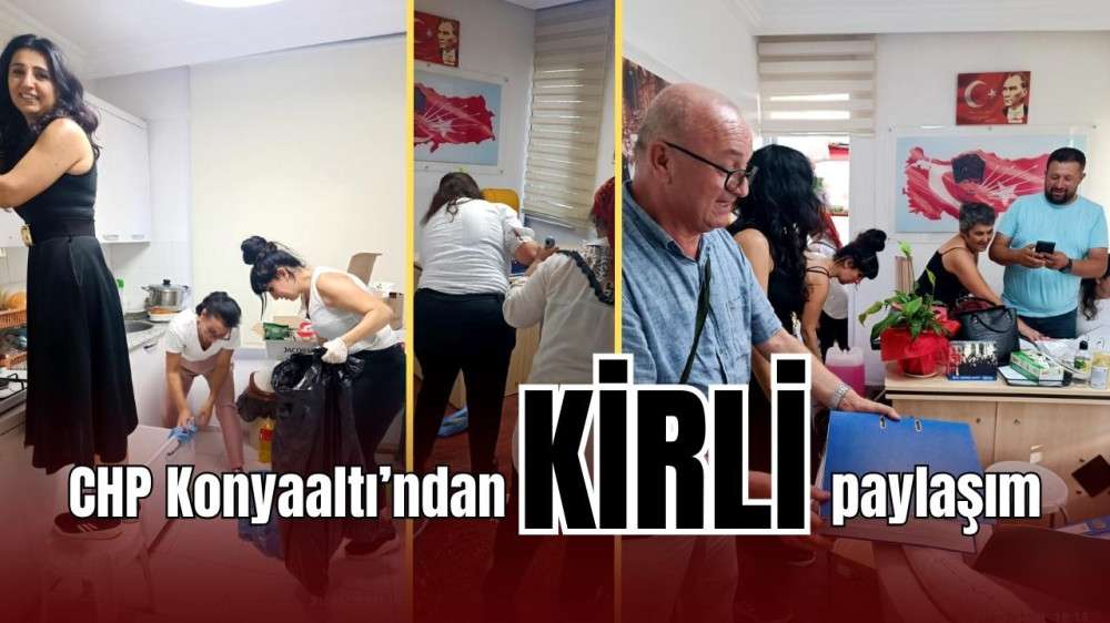 CHP Konyaaltı İlçe Örgütü'nün yeni yönetimi mazbatayı alıp görevi önceki yöneticilerden devraldıktan sonra kolları sıvadı. Demet Gündüz başkanlığındaki ilçe yöneticileri işe ilçe binasında ince temizlik yapmakla başladı. Parti binası dip köşe pırıl pırıl temizlendi. Partiye kadın eli değdiği daha ilk günden belli oldu.”