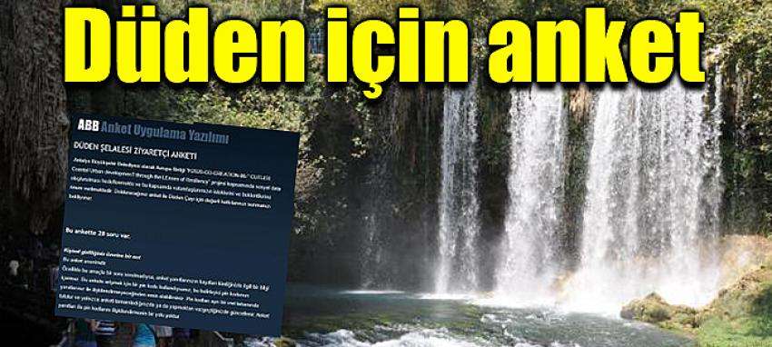 CUTLER Projesi kapsamında gerçekleşen anket çalışması ile Düden Şelalesi ile ilgili vatandaşların istek ve beklentilerinin değerlendirilmesi ve bir sosyal data oluşturulması hedefleniyor. Büyükşehir Belediyesi İmar ve Şehircilik Dairesi Başkanlığı tarafından düzenlenen anket ile doğa harikası Düden Şelalesi'nin niteliği ve etkin kullanımının sağlanması, alanda yapılacak çevresel düzenlemelere doğrudan halkın da katılımının sağlanması amaçlanıyor. Düden Şelalesi Ziyaretçi Anketi çalışmasında 28 soru bulunuyor. Vatandaşlar Antalya Büyükşehir Belediyesi'nin resmi web sitesindeki linkten ankete katılabilecek.