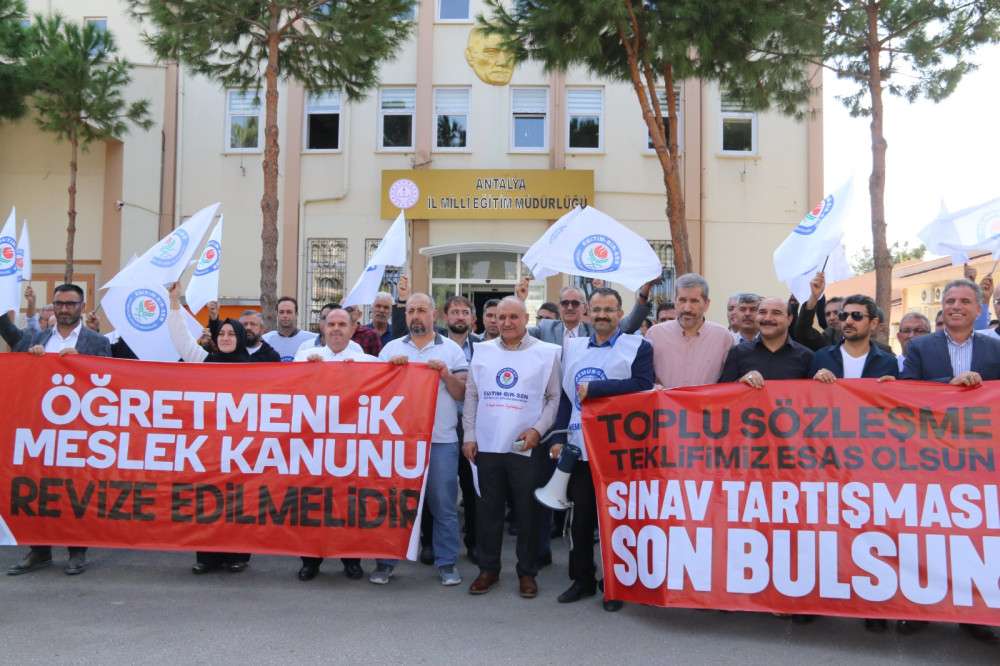 Eğitim Bir Sen Antalya Şubesi’ne üye sendikalılar Antalya İl Milli Eğitim Müdürlüğü önünde toplanarak öğretmenlerin beklentilerini karşılamadığını savundukları Öğretmenlik Meslek Kanununda değişiklik yapılmasını talep etti.