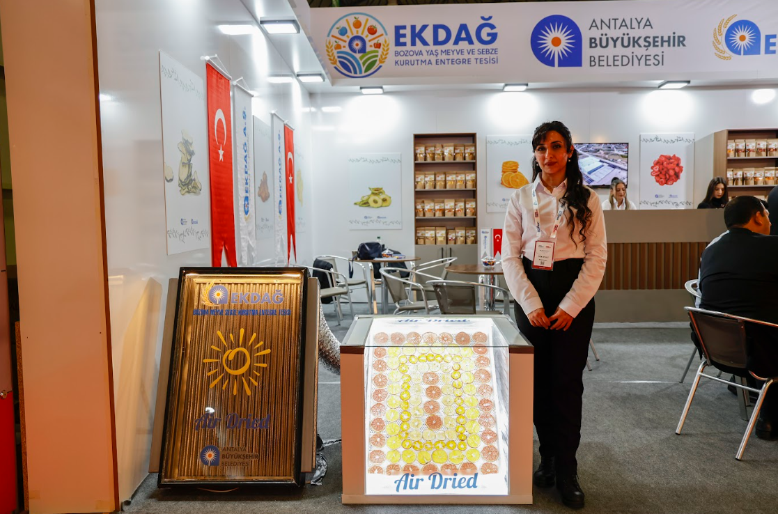 EKDAĞ A.Ş. Genel Müdürü Ahmet Aydın, Antalyalı çiftçilerin alın teri ve bin bir emekle ürettiği domates, patlıcan, biber, portakal, muz, elma, armut ve çilek başta olmak üzere kurutmaya uygun tüm meyve ve sebzeleri en doğal halleriyle kurutarak küresel pazara sunmayı hedeflediklerini belirtti. Aydın ayrıca, bu ürünlerin pastacılık sektöründe kullanıldığını, yüzde 100 doğal meyve harçları ve meyve çaylarının üretiminde değerlendirildiğini ifade etti. Ahmet Aydın, “Bu fuarda bulunma amacımız, Antalya’dan ve farklı illerden gelen işletmeciler ile otelcilerin kullanabileceği ürünlerimizi tanıtmak. Aynı zamanda uluslararası bir fuar olması nedeniyle yurt dışından da ihracat talepleri almayı hedefliyoruz. Antalya’mızın meyve ve sebzelerini yurt dışına göndermeyi planlıyoruz. Fuarın ilk günü olmasına rağmen hem yerli vatandaşlardan hem de yurt dışından gelen turistlerden yoğun ilgi görüyoruz” diye konuştu.