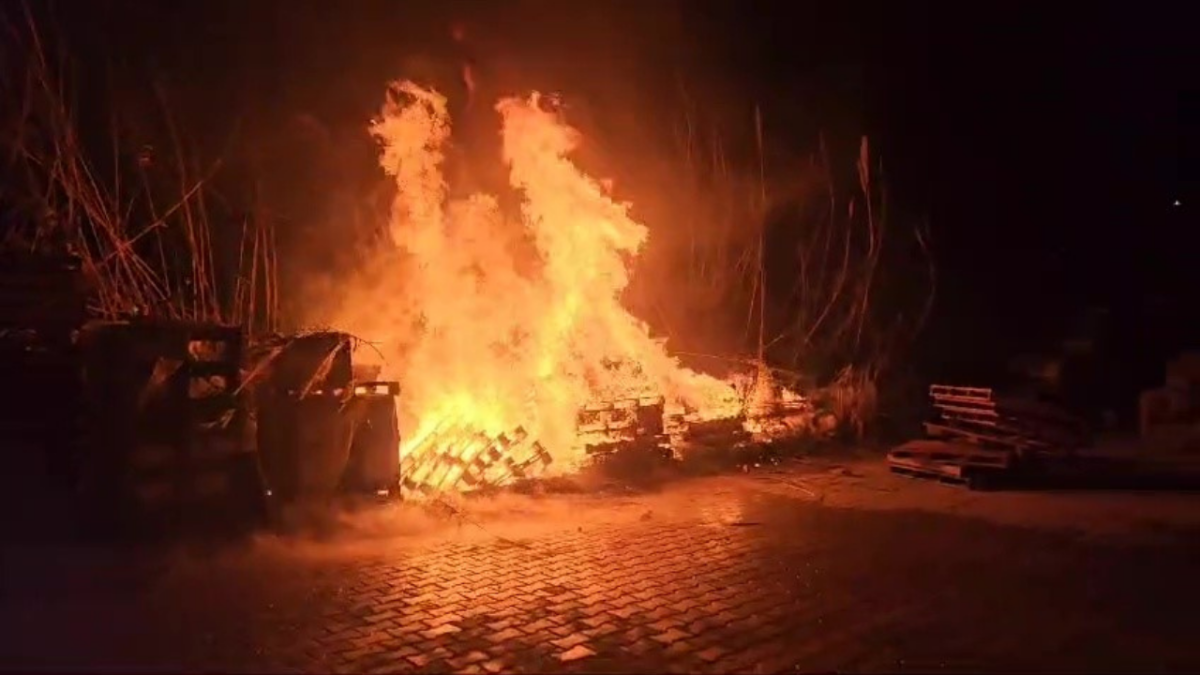 Manavgat'ta elektrik tellerinden çıkan kıvılcımlar iş yerinin önündeki palet ve palmiyeleri tutuşturdu. Çıkan yangın büyümeden söndürüldü.