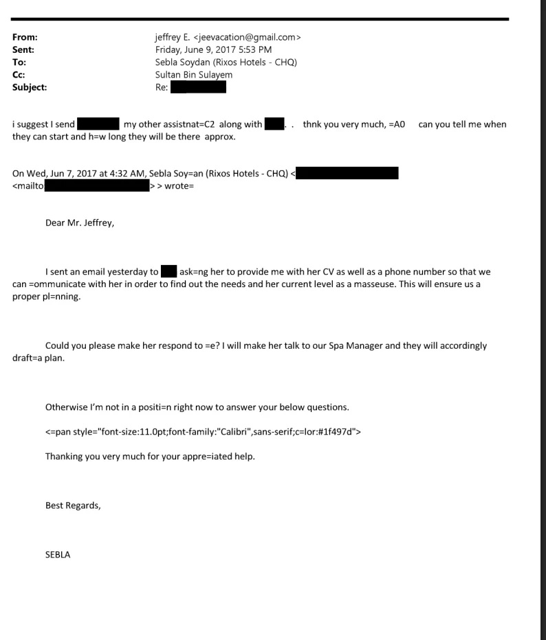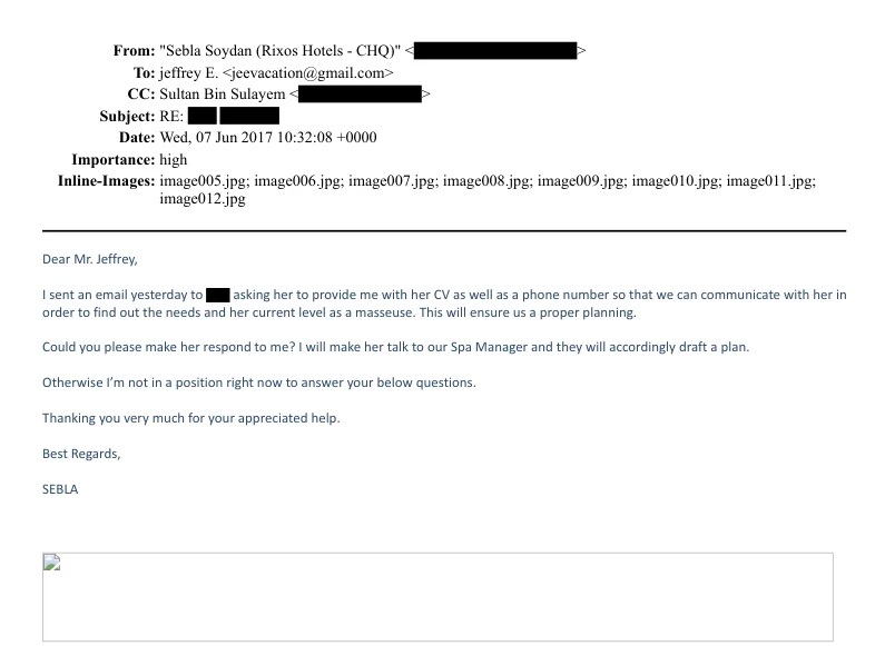 İş sadece tatil ile bitmiyor. Ayrıca dosyalarda, , Jeffrey Epstein’ın özel spa’sında kişisel masöz olarak çalışan bir kadının, Antalya’daki Rixos tesislerinde staj yapmasının talep edildiği görülüyor. Yazışmalarda, söz konusu kişiye daha sonra Epstein’ın asistanı olduğu belirtilen bir başka kişinin de eşlik etmesinin planlandığı, tüm seyahat ve konaklama giderlerinin ise Epstein tarafından karşılandığı ifade ediliyor.