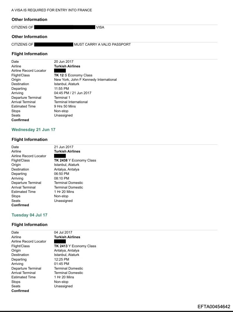 Epistein'in asistanı Lesley Groff 15 Haziraz 2017'de Amex Centurion Travel'e e-posta göndererek, "Bayanların her biri için gidiş-dönüş uçak bileti gerekiyor. 20 Haziran akşamı New York'tan (herhangi bir havaalanından) İstanbul'a (21 Haziran'da varış) uçacaklar, ardından Antalya'ya (Türkiye) geçecekler. 21 Haziran'da Paris'ten İstanbul'a uçup Elina ile buluşacaklar ve birlikte Antalya'ya (Türkiye) uçacaklar, 21 Haziran'da Antalya'ya varacaklar... Her ikisi de 4 Temmuz'da birlikte Paris'e dönecekler. Paris'te kalıp Jeffrey ile buluşacaklar."