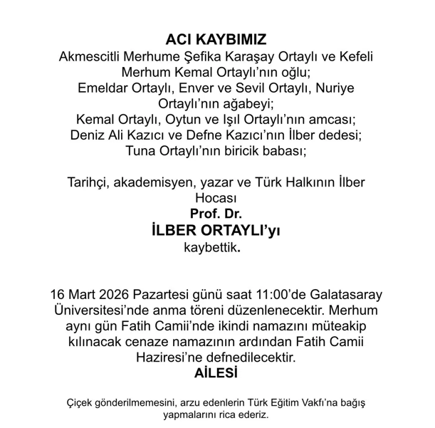 Ailesi tarafından paylaşılan bilgilere göre Ortaylı için 16 Mart 2026 Pazartesi günü saat 11.00’de Galatasaray Üniversitesi’nde anma töreni düzenlenecek.