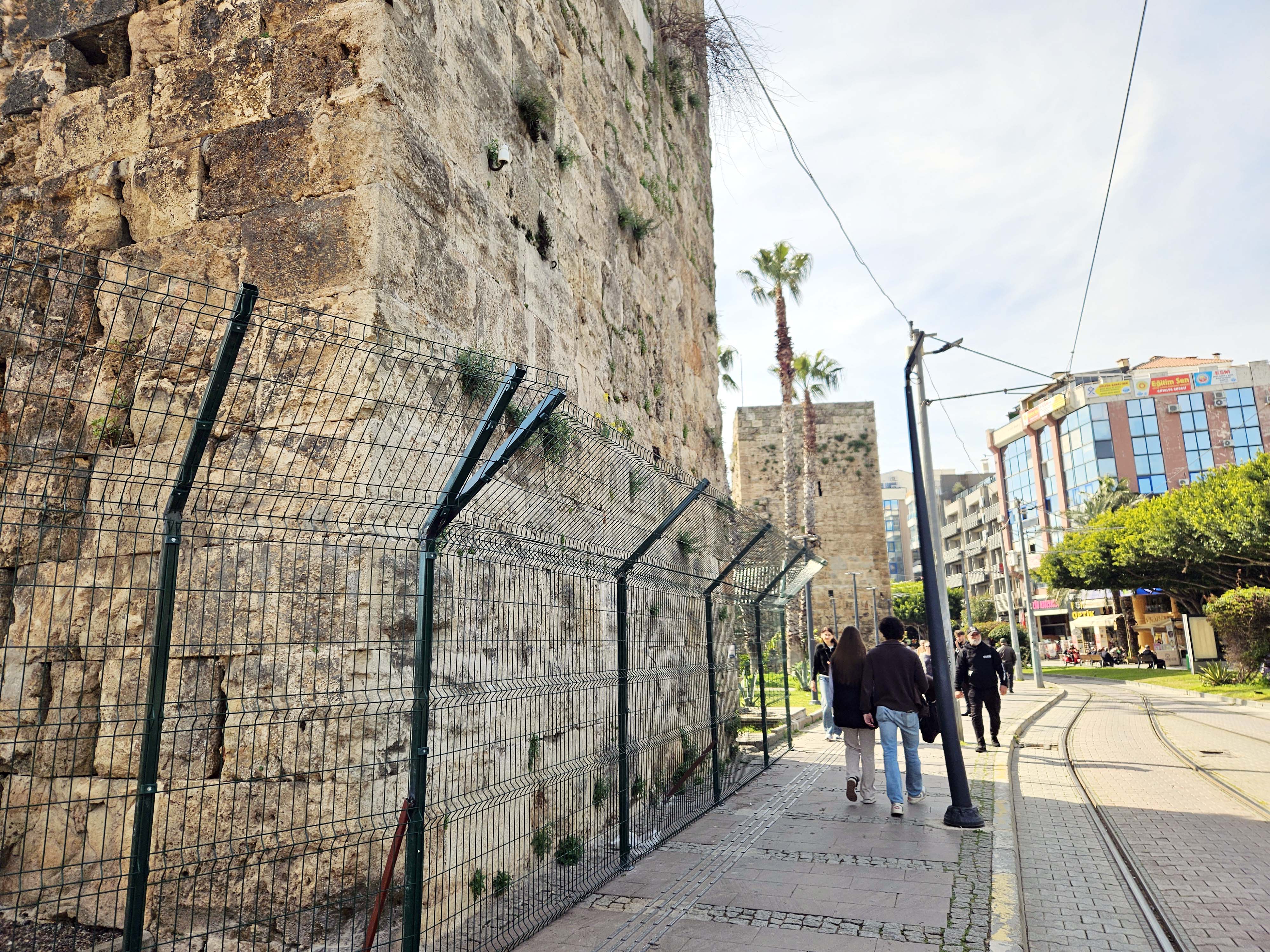 Antalya'da Roma Dönemi'ne ait Kale Kapısı burçlarının çevresi, günde 64 kez geçen eski tip tramvayların oluşturduğu titreşimler nedeniyle yıkılma riskine karşı tel örgüyle kapatıldı.