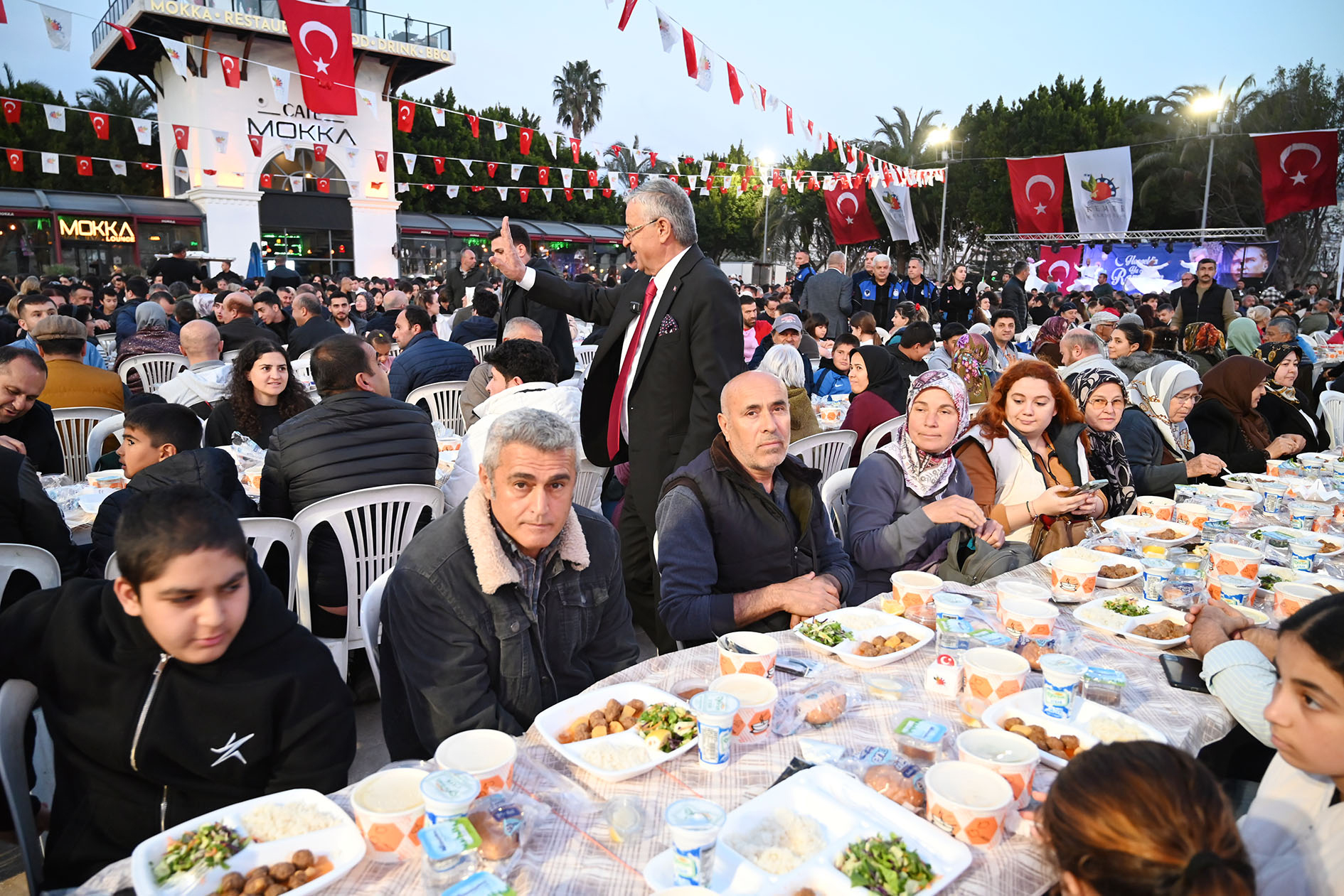 haberimizvar.net- Kemer Cumhuriyet Meydanı'nda düzenlenen iftar yemeğine Belediye Başkanı Necati Topaloğlu'nun yanı sıra CHP Kemer İlçe Başkanı Sedat Karakaya ve ilçe yönetimi, belediye başkan yardımcıları Emin Gül, Semih Top, Mehmet Derya Baytekin, Furkan Üstündağ, Gülsüm Bal, meclis üyeleri Mustafa Bilici, Mehmet Akın, Hüseyin Çelik, Ali Akar, Mustafa Çelik, Sema Özdemir, Cansın Efir, Hüseyin Sek, Timur Zabitoğlu, Antalya Büyükşehir Belediyesi Kemer Koordinatörü İsmail Selami Minta, Kemer Belediyesi mahalle sorumluları, CHP Kemer Kadın Kolları Başkanı Ayşegül Çelebi, belediye birim müdürleri, STK temsilcileri, muhtarlar ve vatandaşlar katıldı.