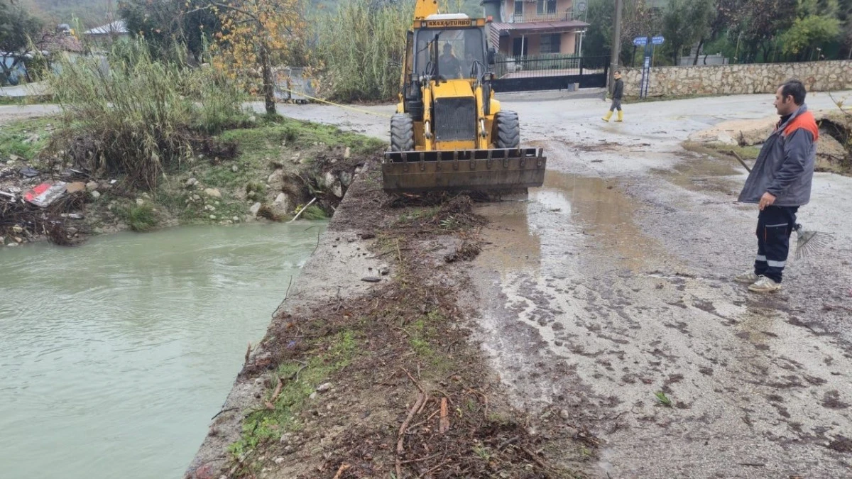 Kemer Belediye ekipleri, Beldibi Mahallesi'nde şiddetli sağanak nedeniyle dağlık alandan koparak akıntıyla birlikte gelen ve köprüleri tıkayan tomruklar ile atıkların temizliğini yaptı.