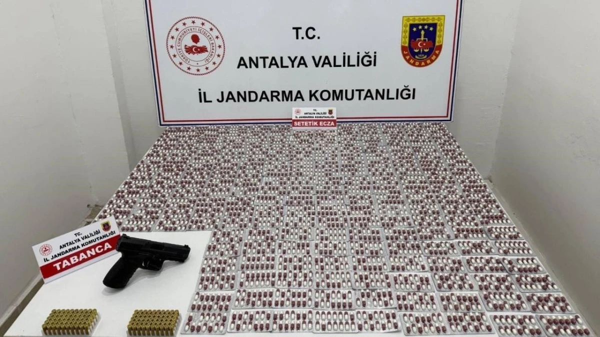 Antalya'nın Kepez ilçesinde jandarma ekiplerince gerçekleştirilen operasyonda bin 298 adet uyuşturucu hap, 1 adet ruhsatsız tabanca ve çok sayıda tabanca mermisi ele geçirildi.