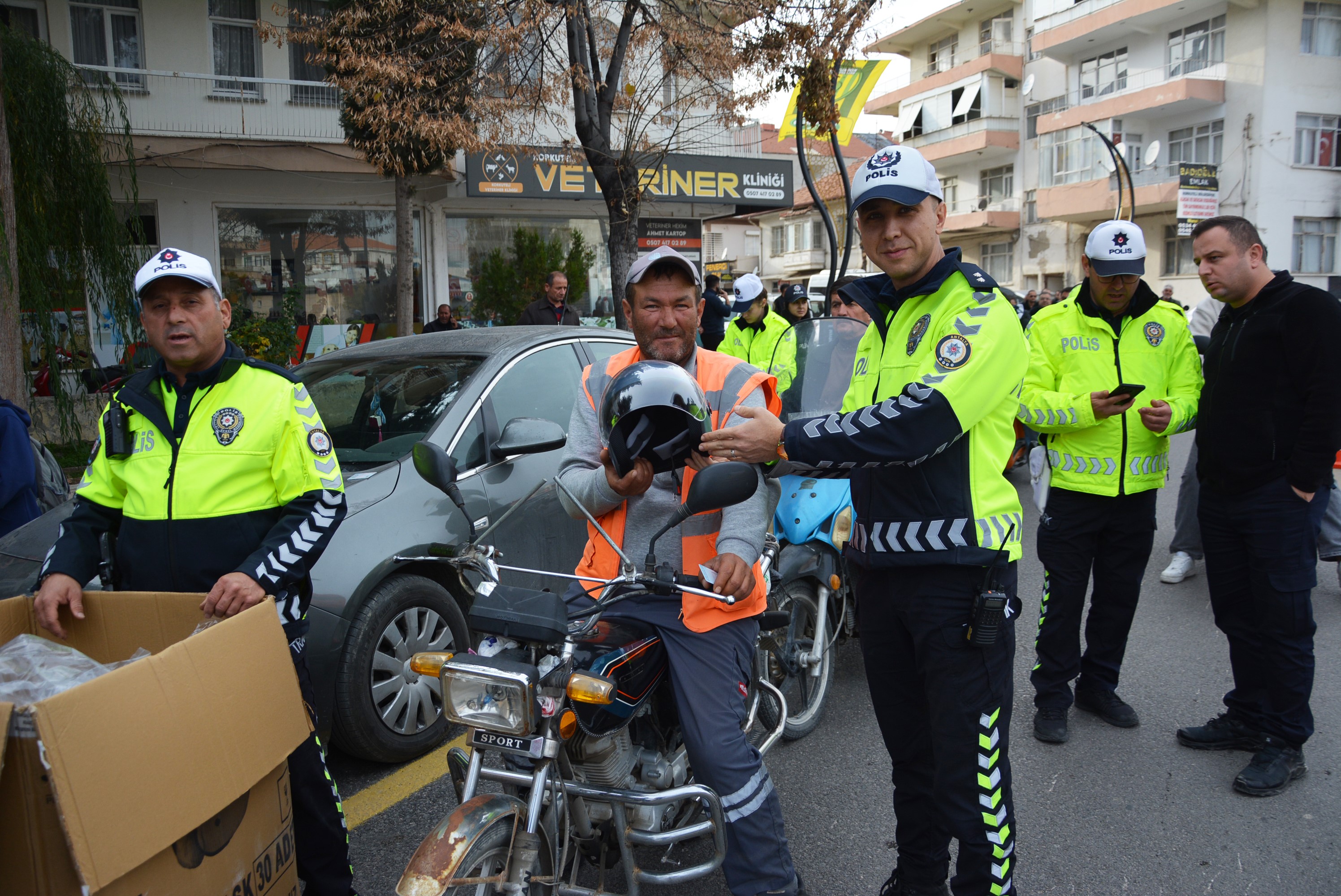 Korkuteli'nde motosiklet sürücülerine kask dağıtıldı