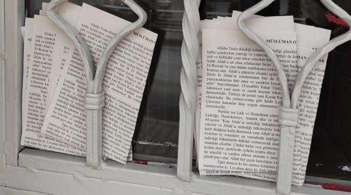 Bu sabah saatlerinde binaların kapılarına bırakılan bildirilerde, demokrasi ve laikliği ‘küfür’, oy kullanmayı ise ‘kafirlik’ olarak nitelendiren ifadeler yer aldı.