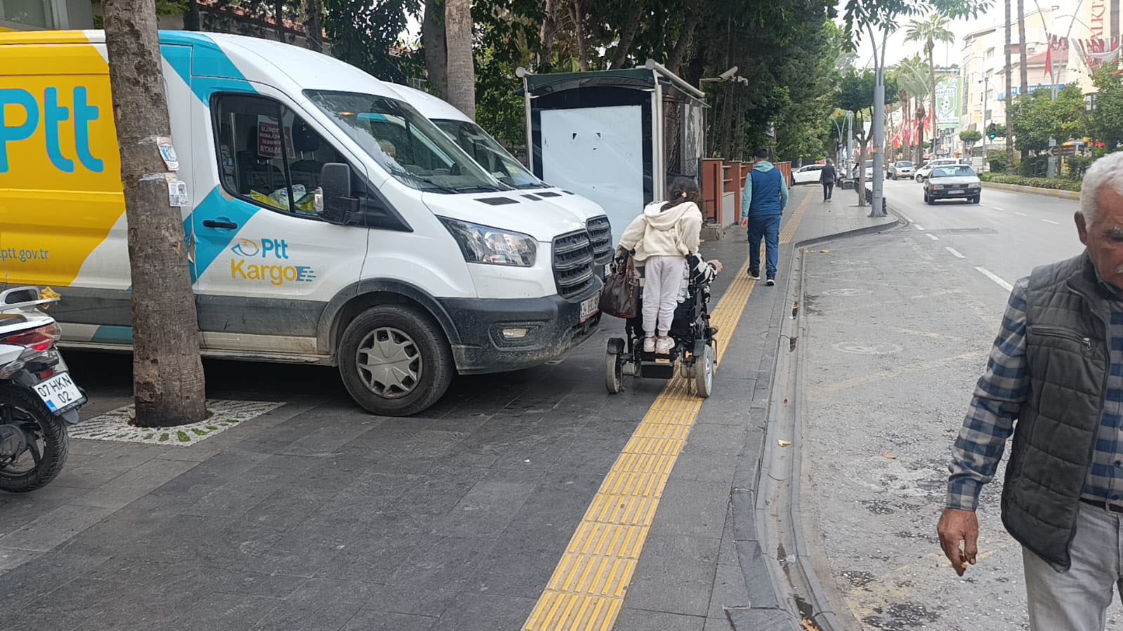 Antalya'nın Manavgat ilçesinde şube önünde park eden PTT minibüsleri kaldırımı ve işaretlenip engellilere ayrılan engeli geçişlerini kapatıp geçişe engel oluyor. Bu sabah saatlerinde bir engellinin park eden minibüs sebebiyle yoluna devam edememesi üzerine görevlinin engelliye yolun karşısına geçip oradan geçmesini söylemesi vatandaşı çileden çıkardı. Tepkiler üzerine minibüs yarım metre geri çekilip yol açıldı.