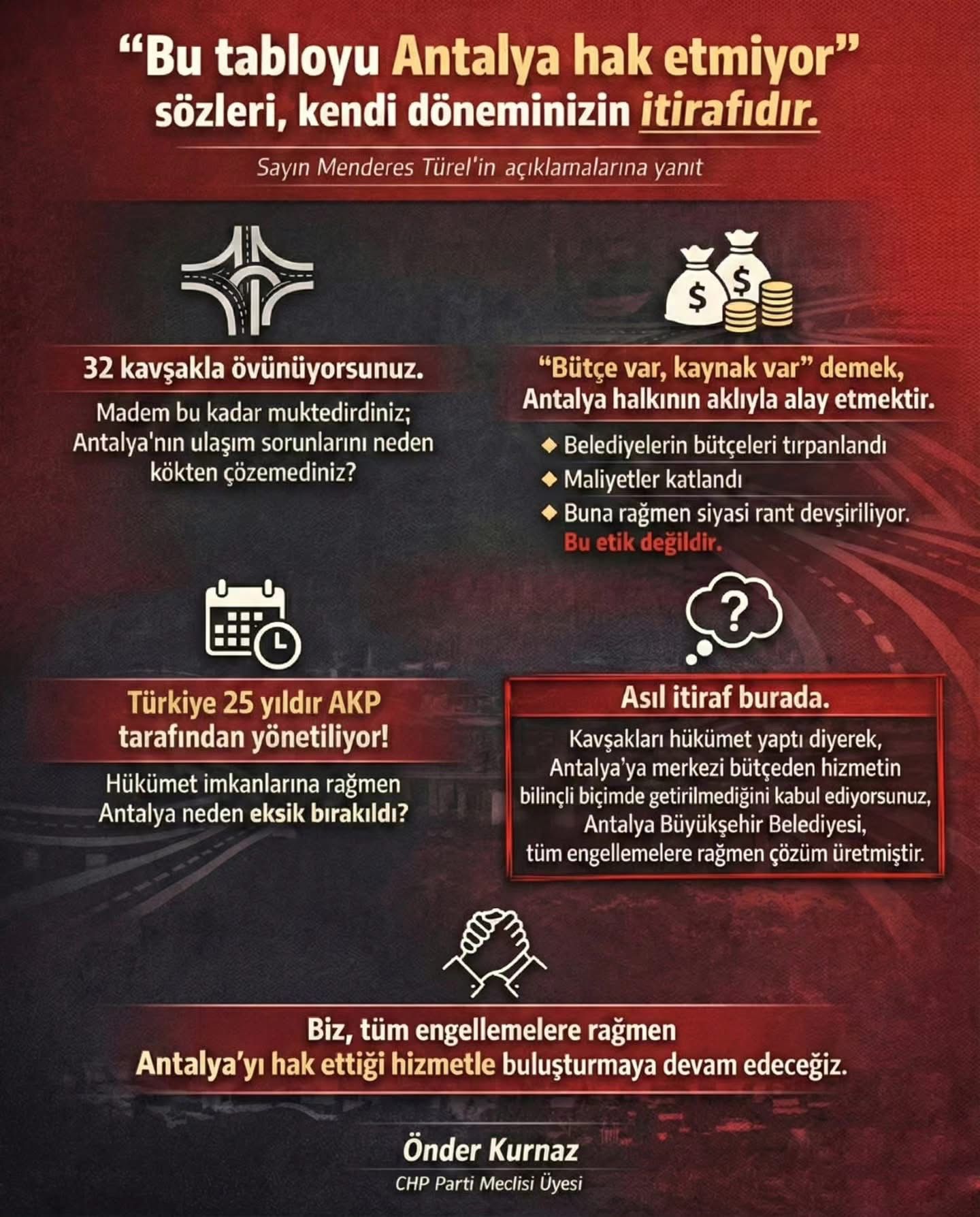 Türel'in Antalya Büyükşehir Belediyesi'ne yönelik açıklamalarının ardından CHP PM Üyesi Önder Kurnaz, sosyal medya hesabından açıklama yaptı. Türel'in söylediği her cümleye cevap veren Kurnaz, şunları kaydetti: