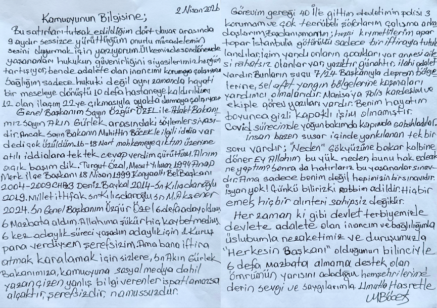 Tutuklu bulunan Muhittin Böcek, yaklaşık 9 aydır onurlu bir mücadele verdiğini ifade ederek, sağlık sorunlarına ve yargı sürecine dikkat çekti. Çalışma arkadaşlarının haksız yere tutuklandığını ileri süren Böcek, “6 kez adaylık süreci yaşadım, adaylık için 1 kuruş para verdiysem şerefsizim. Ama bana iftira atmak karalamak için sizlere, Sayın Akın Gürlek Bakanımıza, kamuoyuna sosyal medya dahil yazan çizen, yanlış bilgi verenler ispatlamazsa alçaktır, şerefsizdir, namussuzdur” dedi.