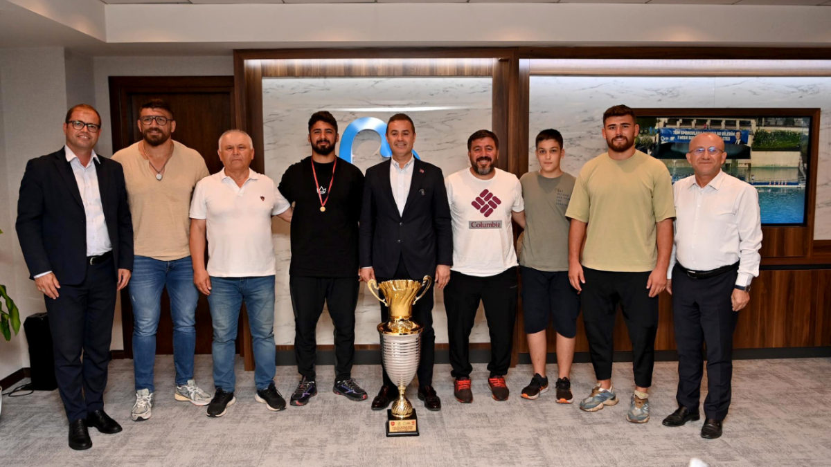 Antalya Muratpaşa Belediyespor’un başpehlivanı Enes Doğan, ‘64. Geleneksel Kurtdereli Mehmet Pehlivan Yağlı Güreşleri’nde uzandığı kupasıyla Balıkesir Büyükşehir Belediye Başkanı Ahmet Akın’ı ziyaret etti.