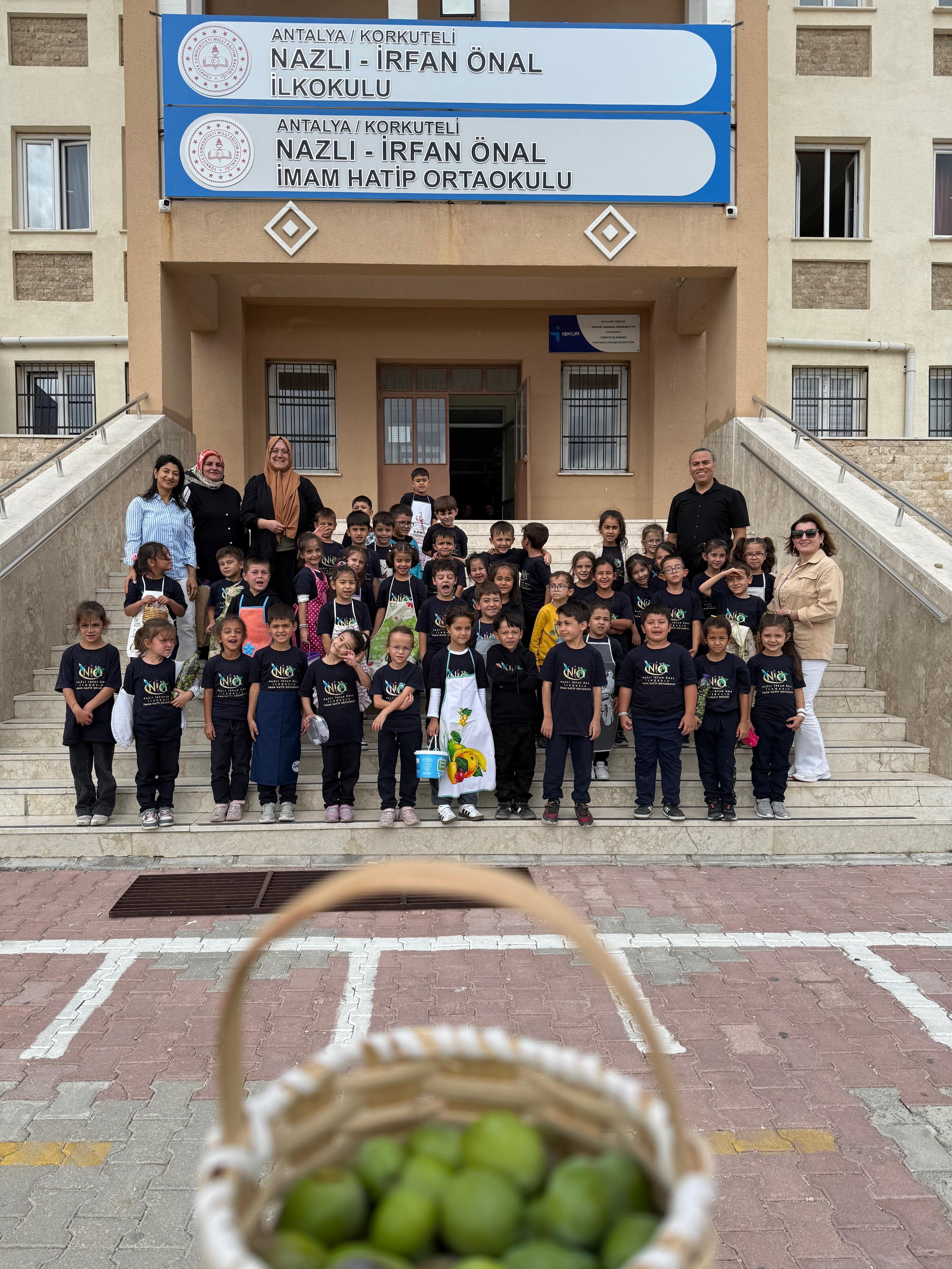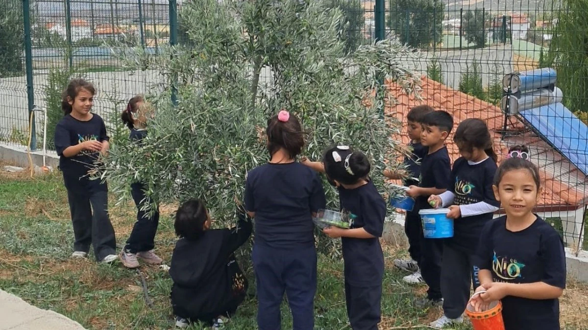 Korkuteli Nazlı İrfan Önal İlkokulu'nda eğitim, dört duvarla sınırlı kalmayıp öğrencilere doğayı ve üretimi deneyimleme fırsatı sunuyor. Okul bahçesindeki zeytin ağaçları, bu yıl 1. sınıf öğrencilerinin katılımıyla hasat edildi.