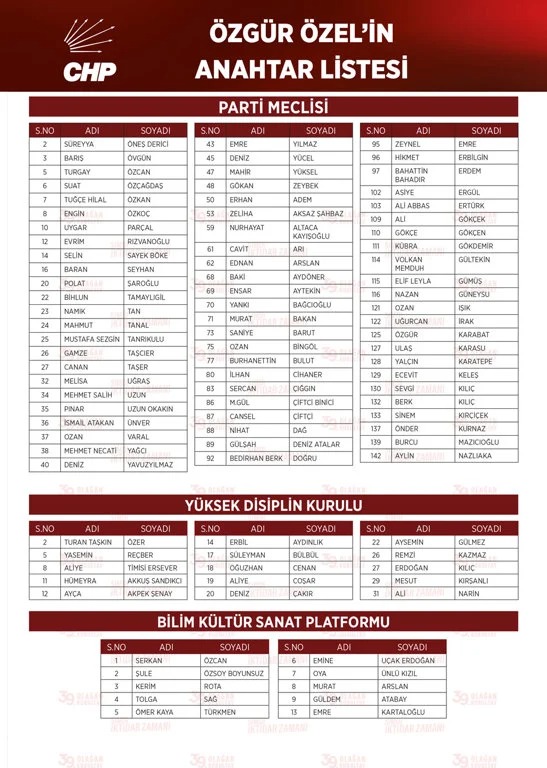 Özel, anahtar listesinde Yüksek Disiplin Kurulu'nda ise, Antalya Milletvekili Aliye coşar yer aldı.
